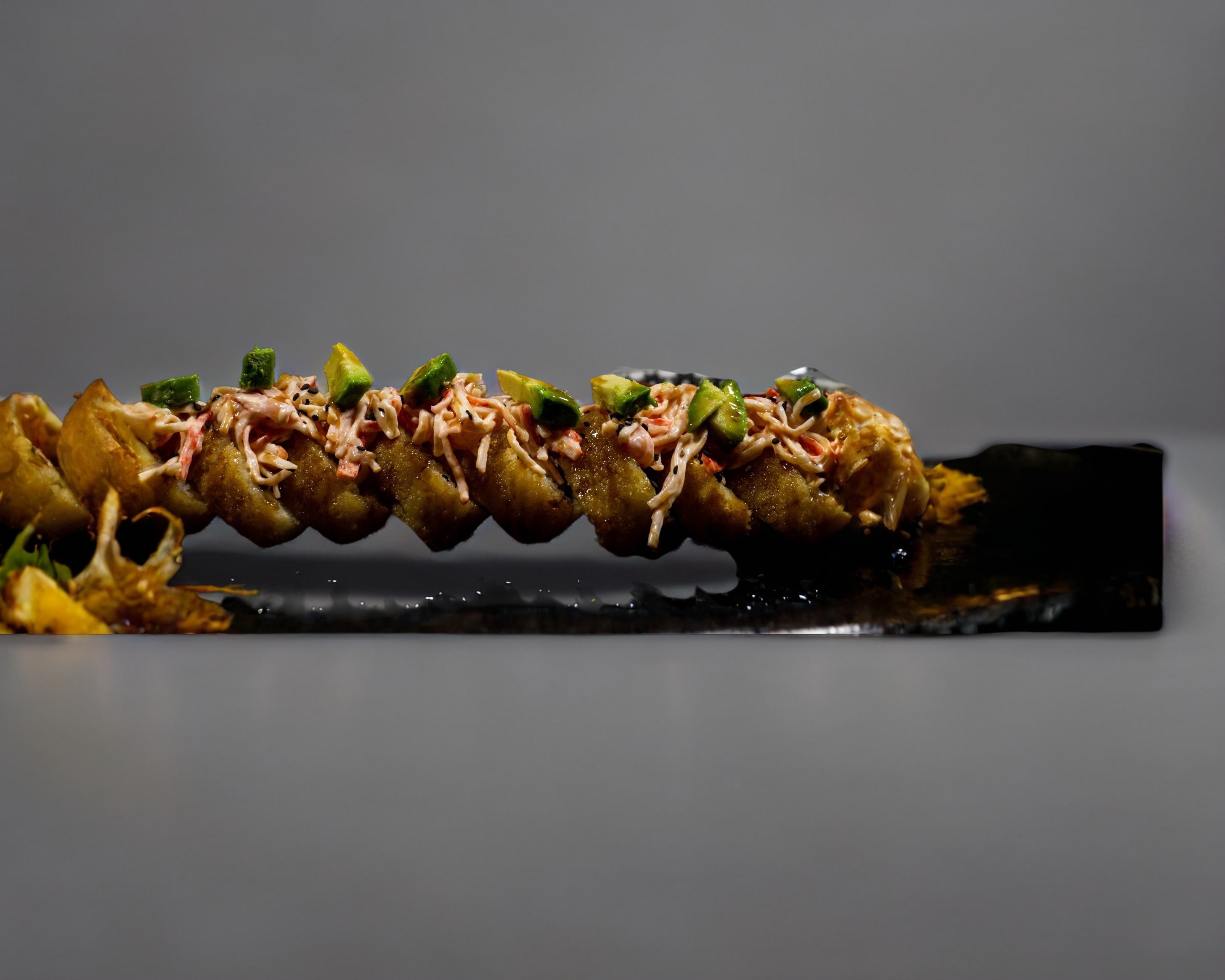 Por dentro pepino, aguacate, Philadelphia, cubierto de plátano, topping de camarón frito, aderezo de spicy y ajonjolí.