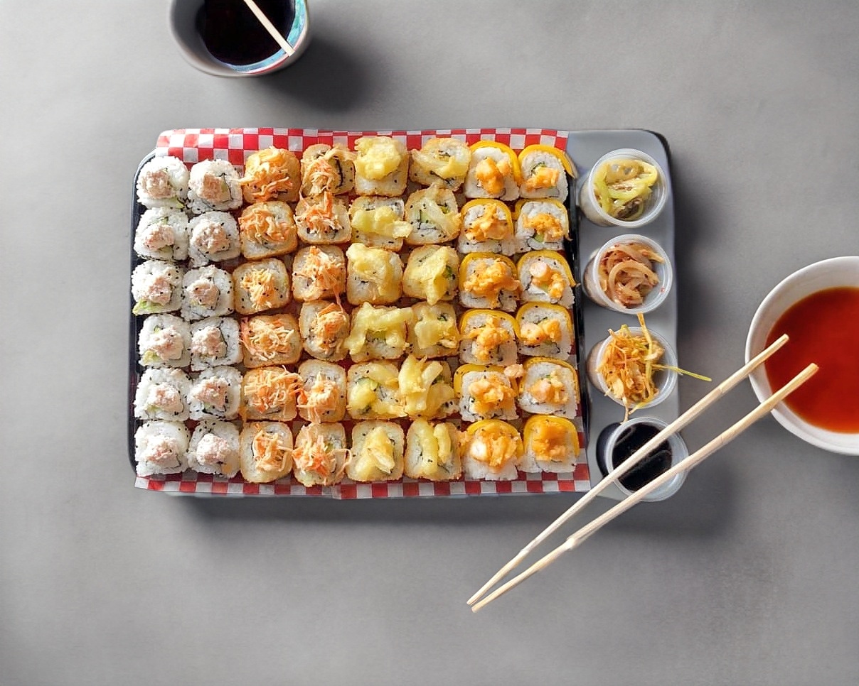 2 Rollos naturales ( Philadelphia, pepino y aguacate, por dentro) 2 Rollos empanizados ( Pepino, Philadelphia, aguacate) topping kanikama y tampico acompañados de verduras en tempura.