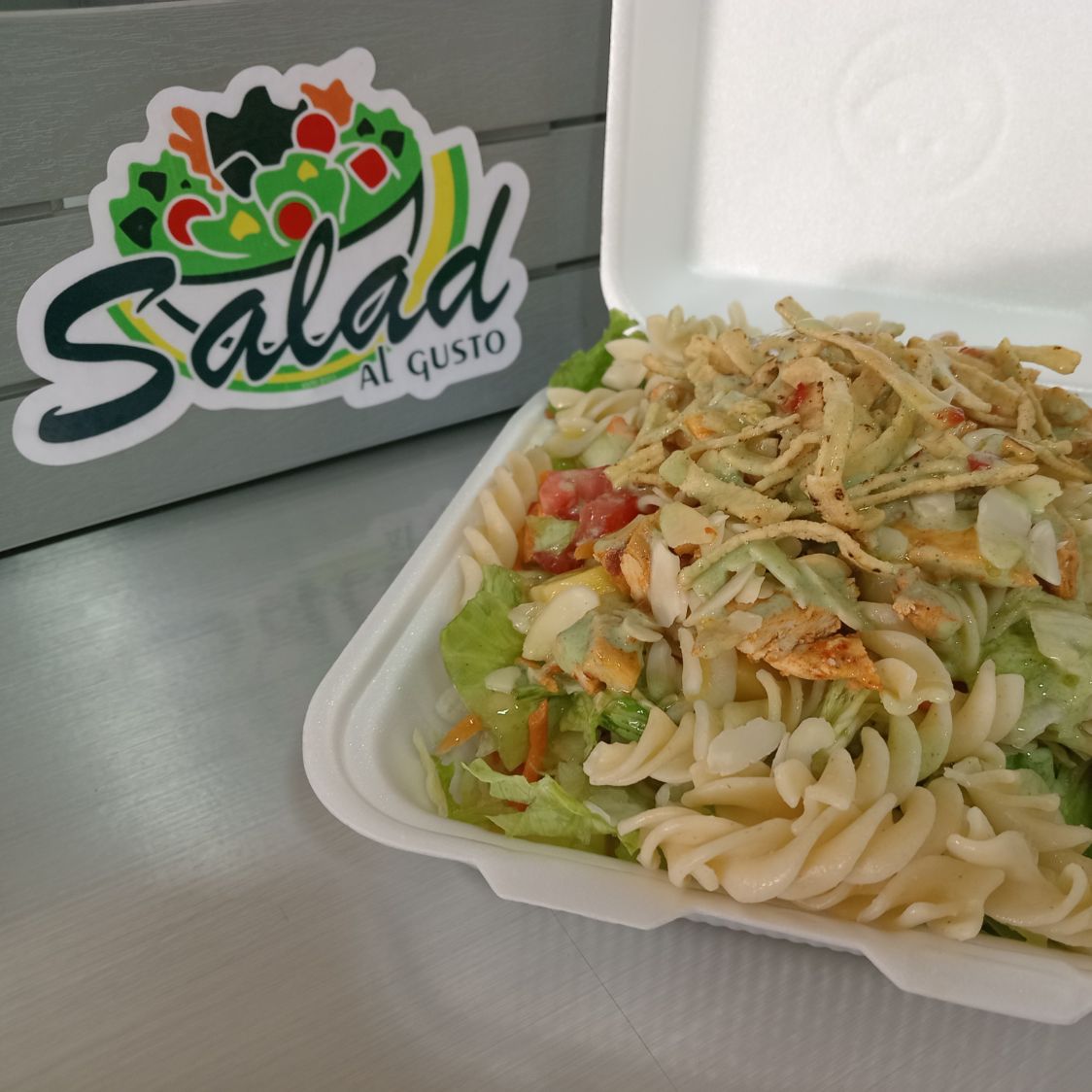 Ensalada (550grs) preparada con una cama de 2 tipos de lechuga como base, 4 verduras a elegir, 1 fruta a elegir, 1 proteína a elegir, 2 complementos a elegir, de 1 a 2 aderezos de tu preferencia, porción de pasta (Opcional) y de obsequio una gelatina de agua sabor fresa de 200ml.