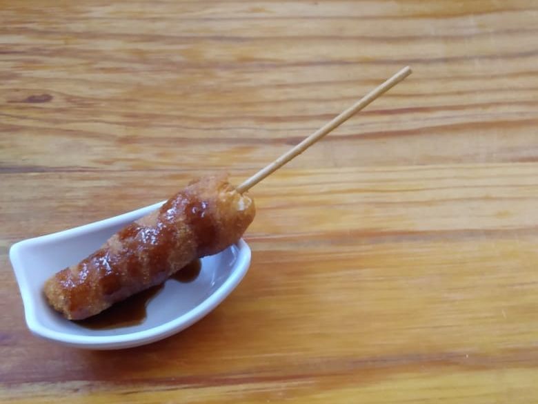 Bola deKushiage Camarón: empanizada, en palillo, acompañada de salsa agridulce.