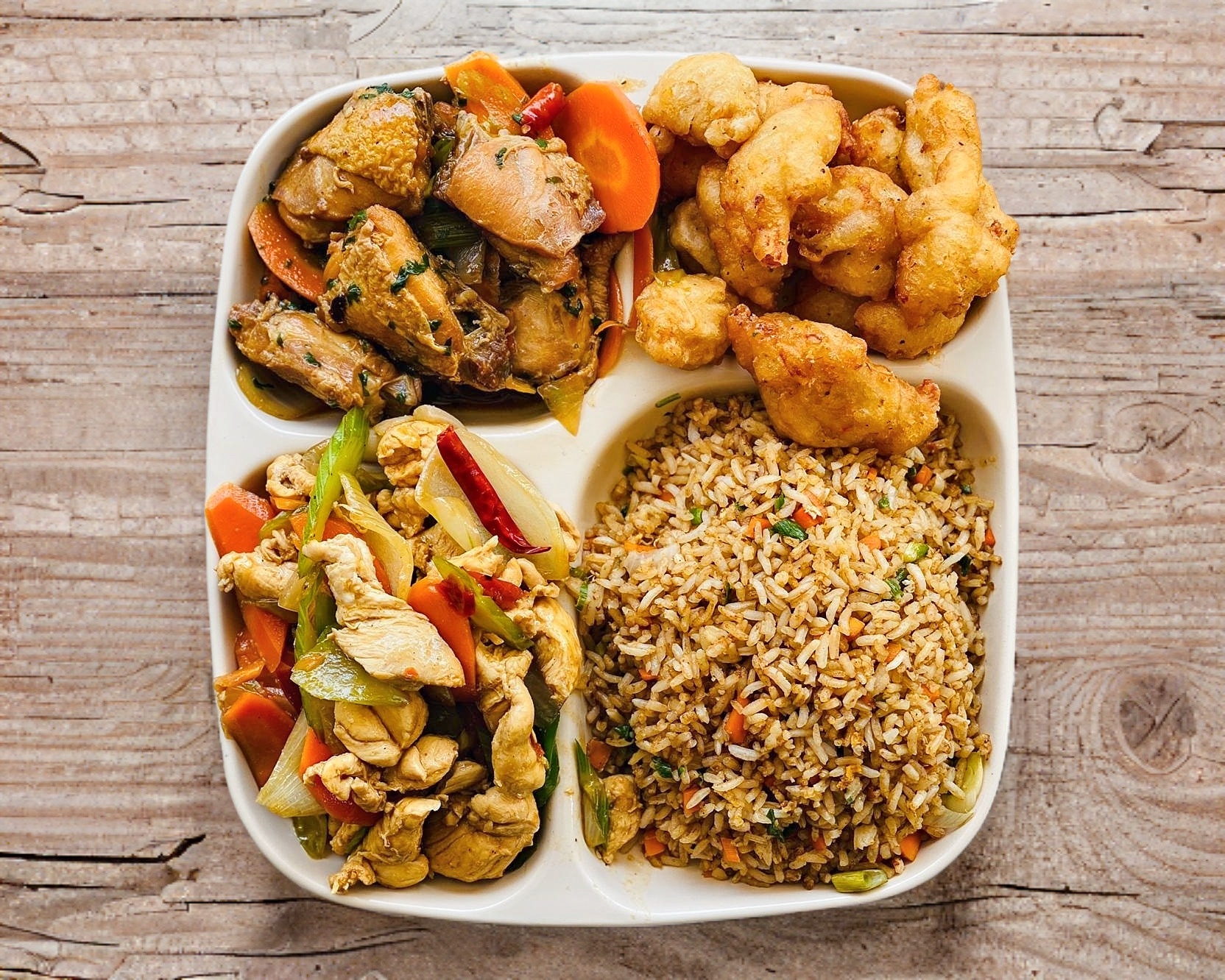 Para 1 o 2 personas: Arroz o espagueti + 4 guisados a elección + salsas agridulce, soya con picante, cubiertos y servilletas.