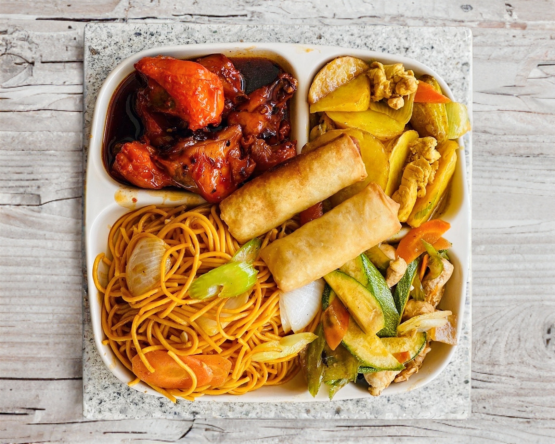 Arroz o espagueti + 1 guisado + salsas agridulce, soya con picante, cubiertos y servilletas.