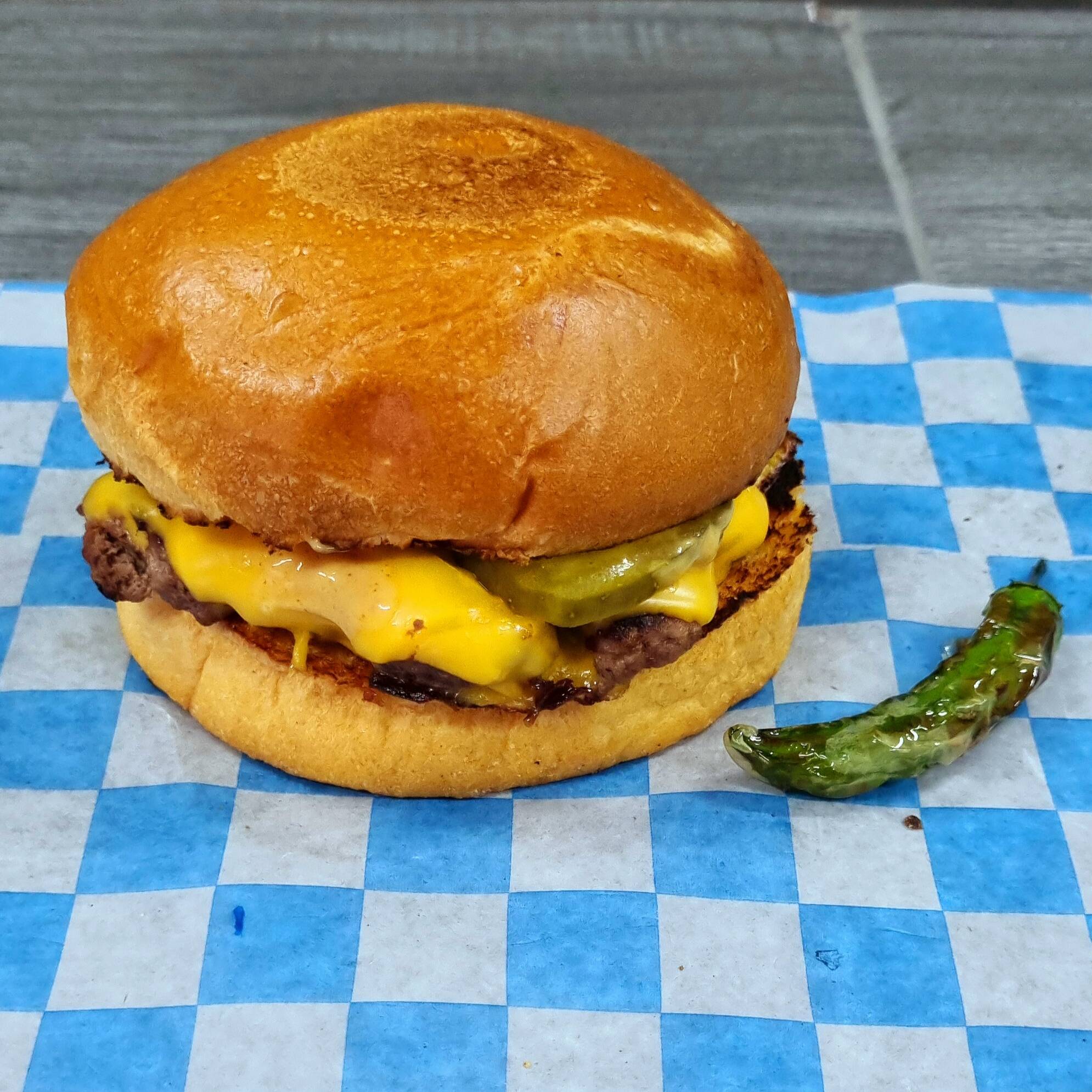 Carne, doble queso americano, cebolla caramelizada, aderezo clasico, pepinillos