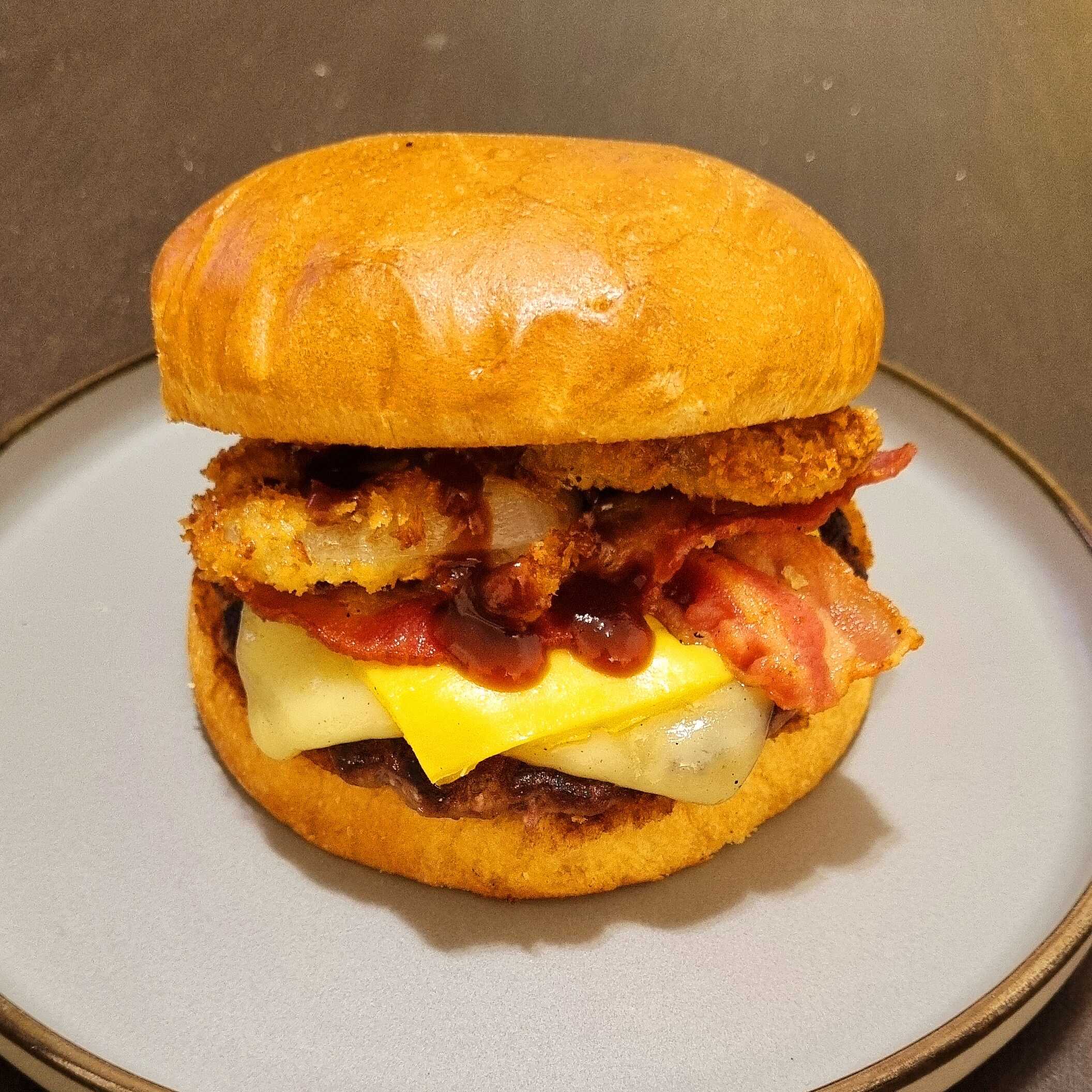Carne, queso americano, queso cheddar, aros de cebolla, tocino, BBQ, aderezo clasico, pepinillos