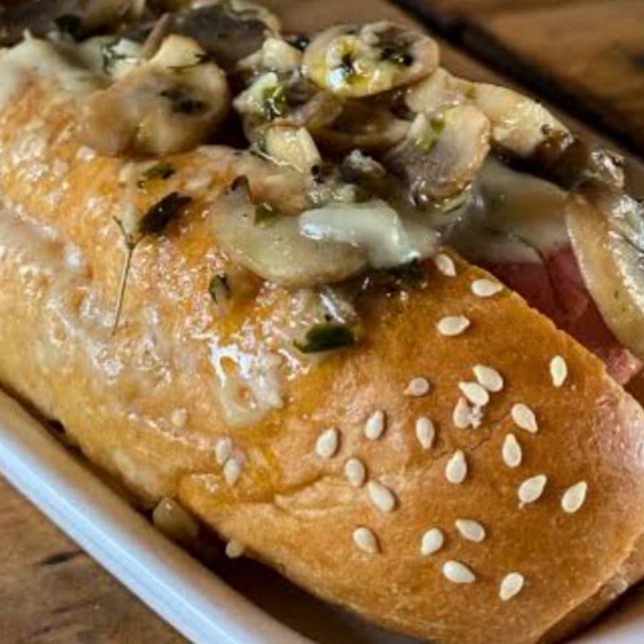 2 salchichas de pavo,pan artesanal, champiñones , queso mozzarella,cebolla caramelizada, jitomate, catsup y mostaza chile vinagre