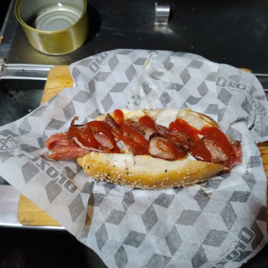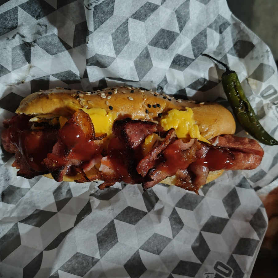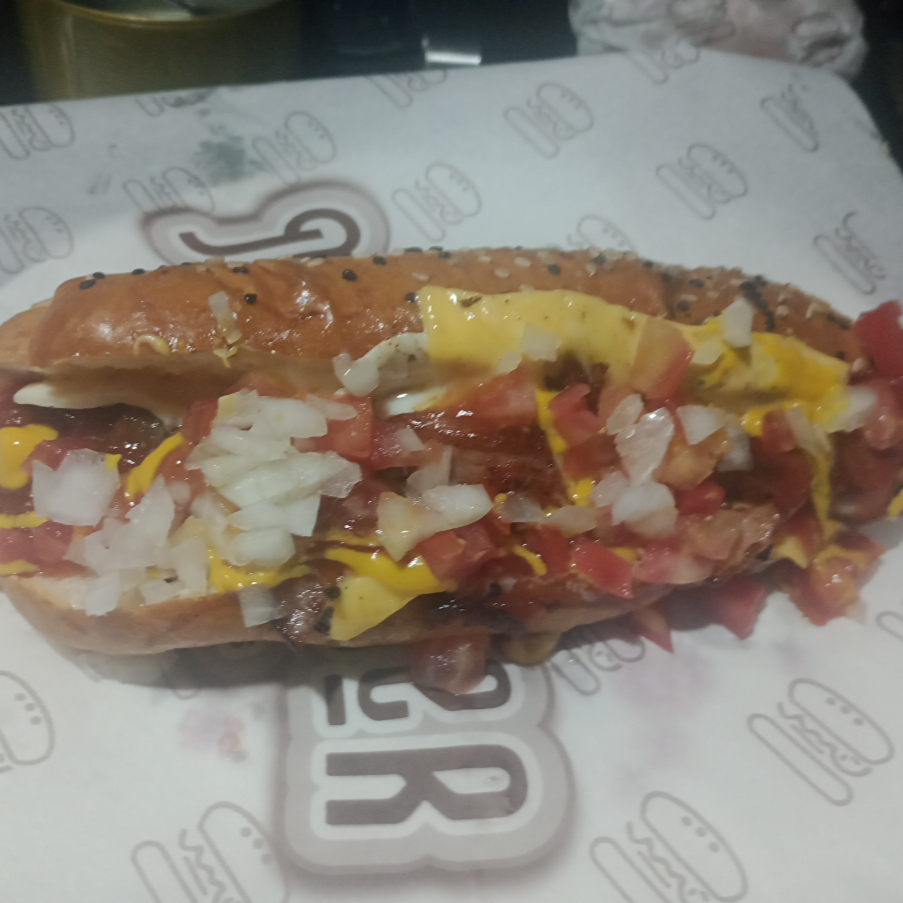 2 salchichas de pavo,pan artesanal,queso amarillo y queso manchego tocino, cebolla, jitomate, catsup y mostaza chile vinagre