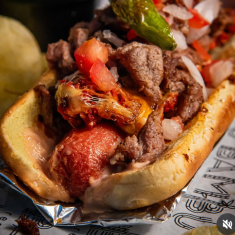 Arrachera ,pan artesanal, queso amarillo cebolla caramelizada ,jitomate, catsup y mostaza chile vinagre