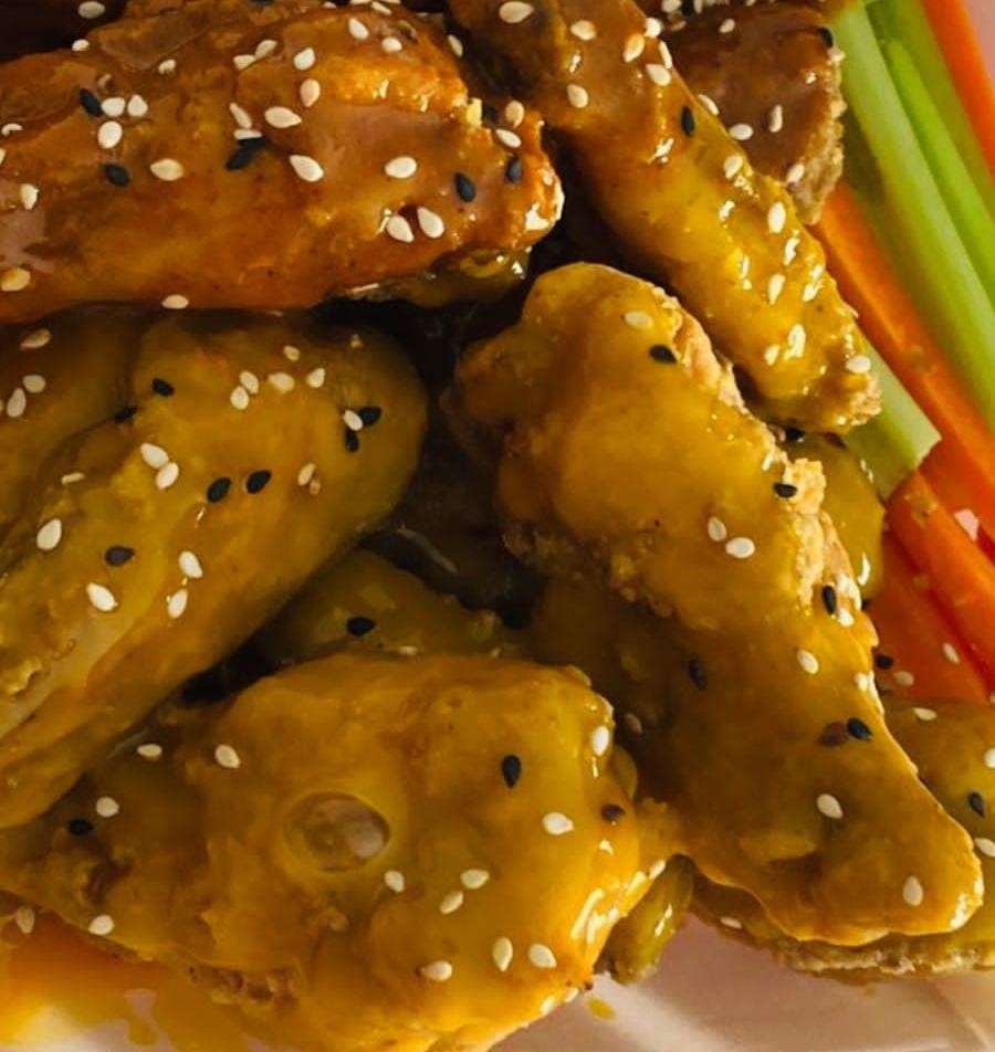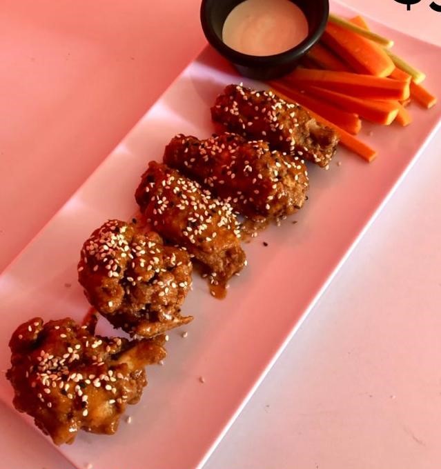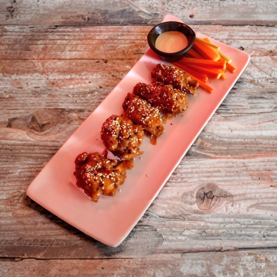 5 piezas de alitas acompañada de aderezo ranch y bastones de zanahoria y apio