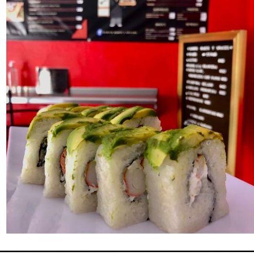 Aproximadamente diez a doce bocados de camarón philadelphia aguacate y pepino con salsa tampico.