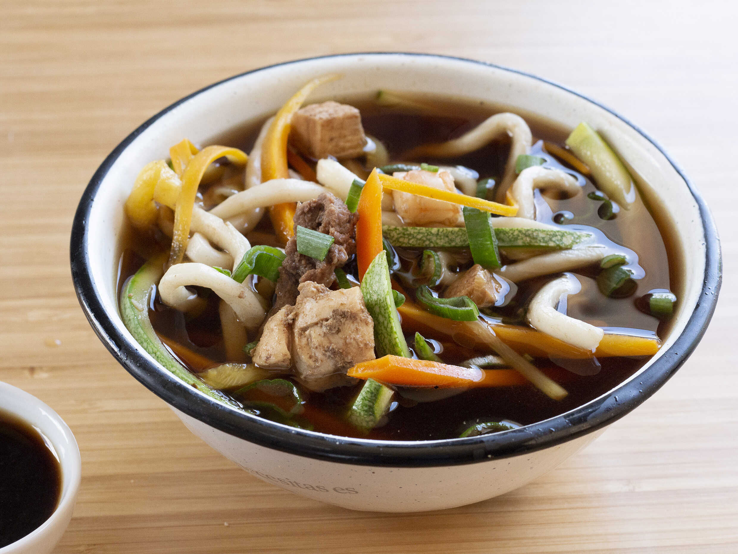 Pasta gruesa con caldo de verduras. Incluye camarón, arrachera y pollo