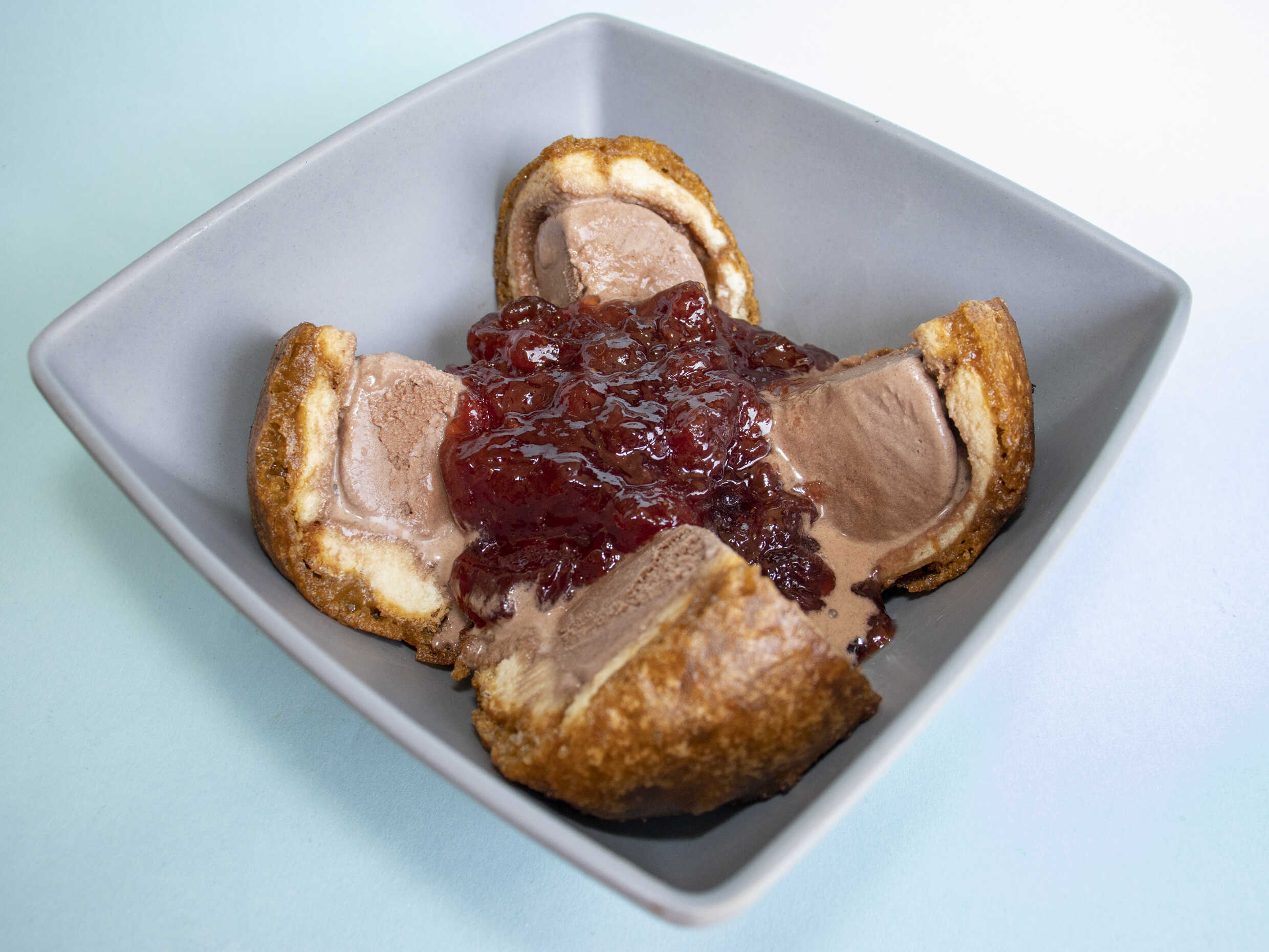 Camarón, philadelphia y mango con coco tostado por fuera.