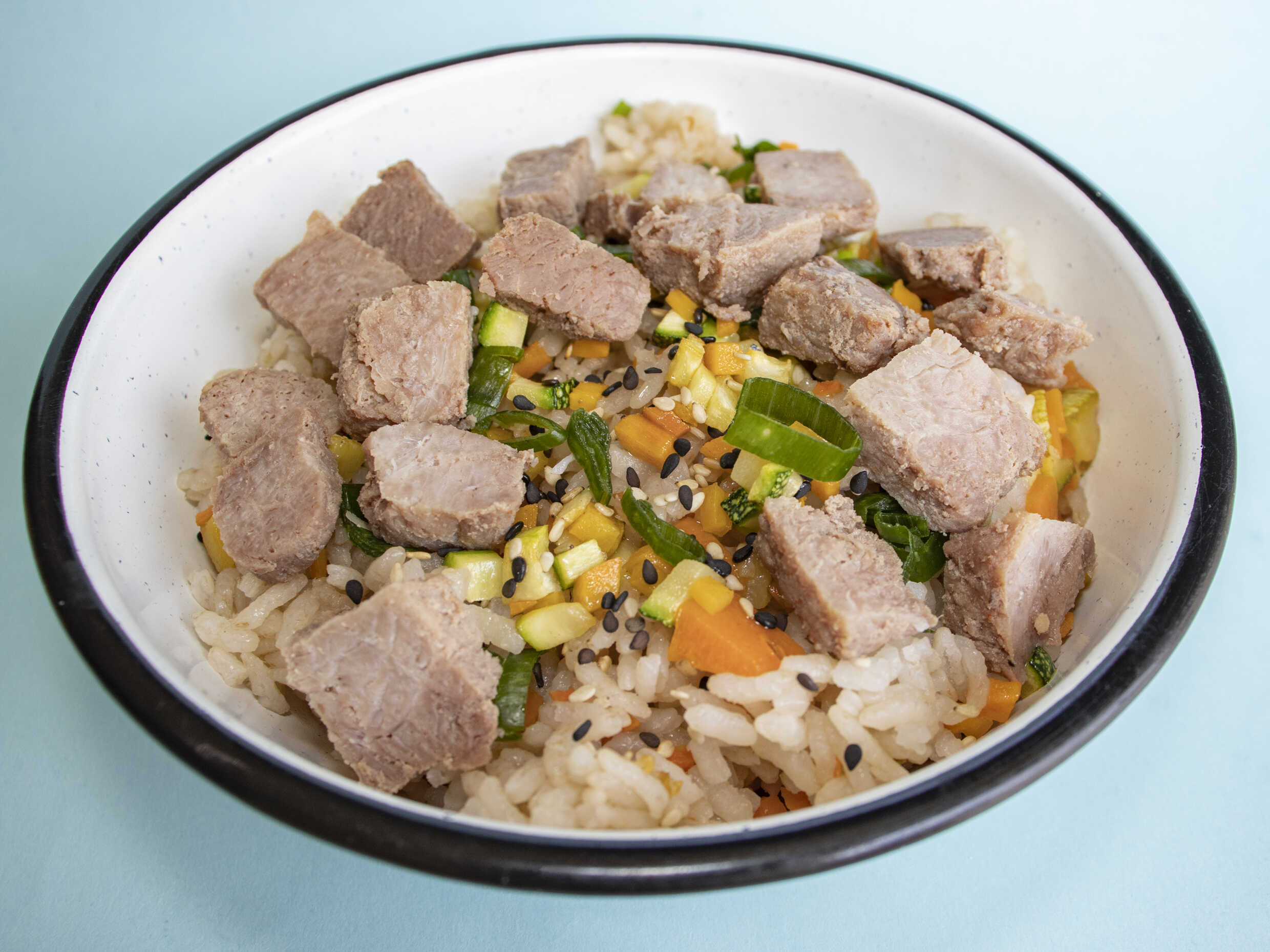Arroz blanco al vapor con arrachera, philadelphia, aguacate y tampico