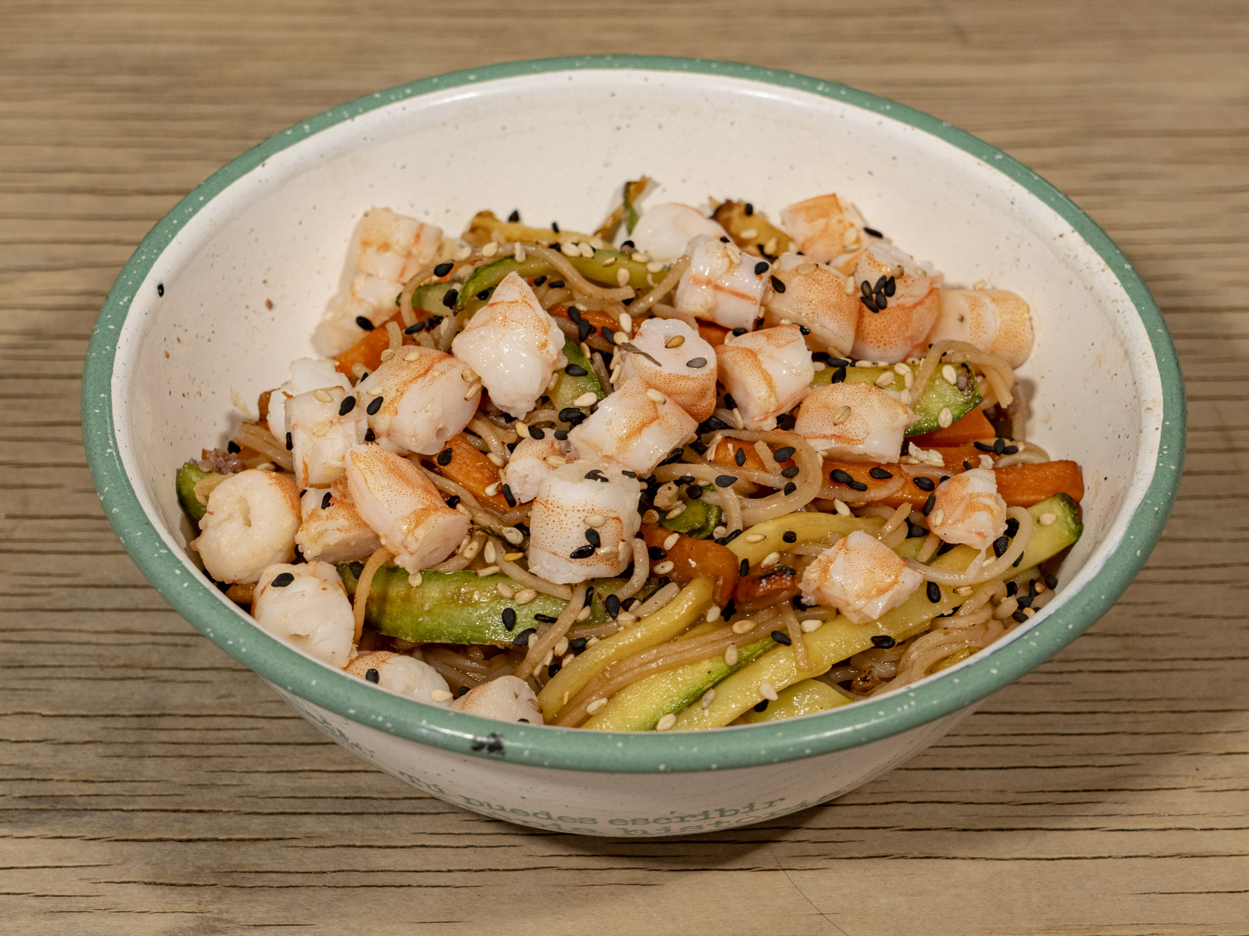 Caldo con fideo chino, surimi, camarón, kanikama y aguacate