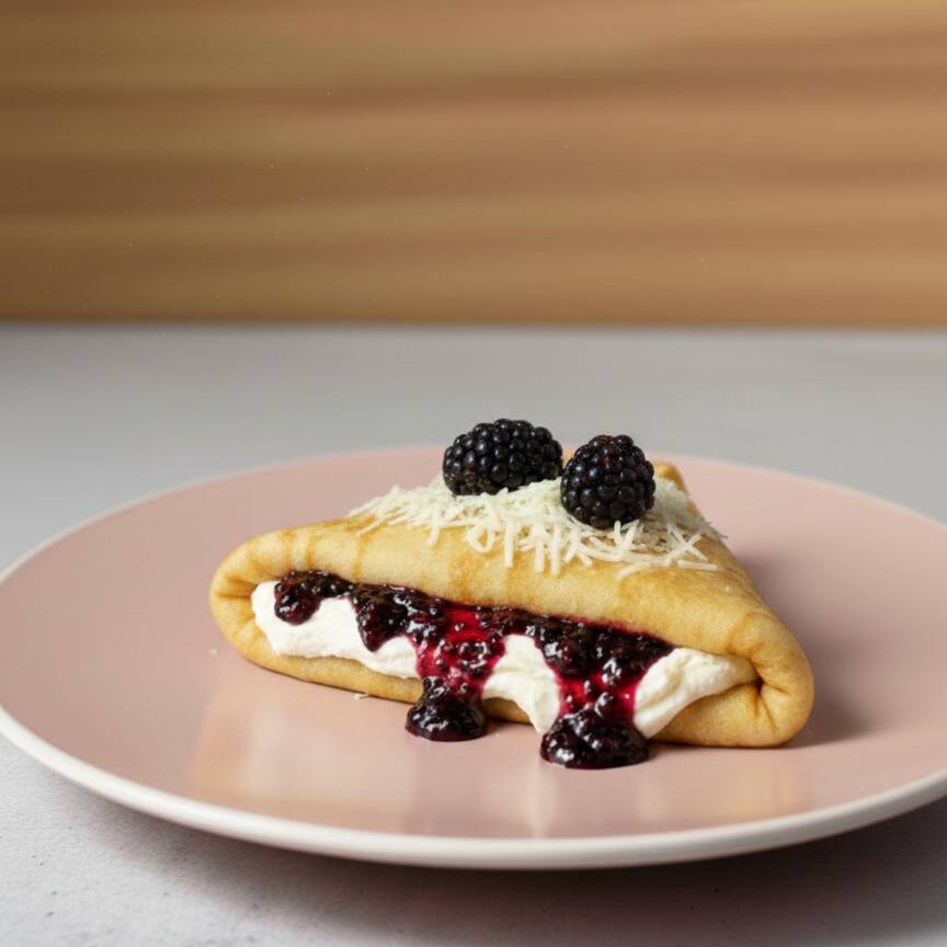 Deliciosa crepa rellena de mermelada sabor Zarzamora y queso Philadelphia