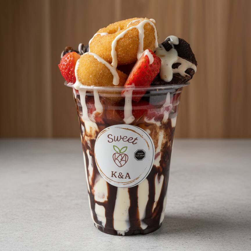 Disfruta de unas deliciosas fresas con crema acompañadas de donas- Elige 1 Topping + 1 Jarabe + 1 Topping especial