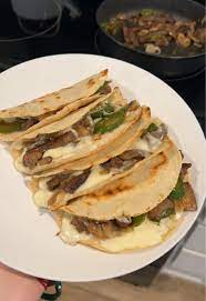 Tortilla de harina con queso y bistec de res, acompañado de verdura, salsas y limón.