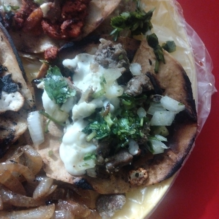 Doble tortilla de maíz con bistec de res, acompañado de verdura, salsas y limón.