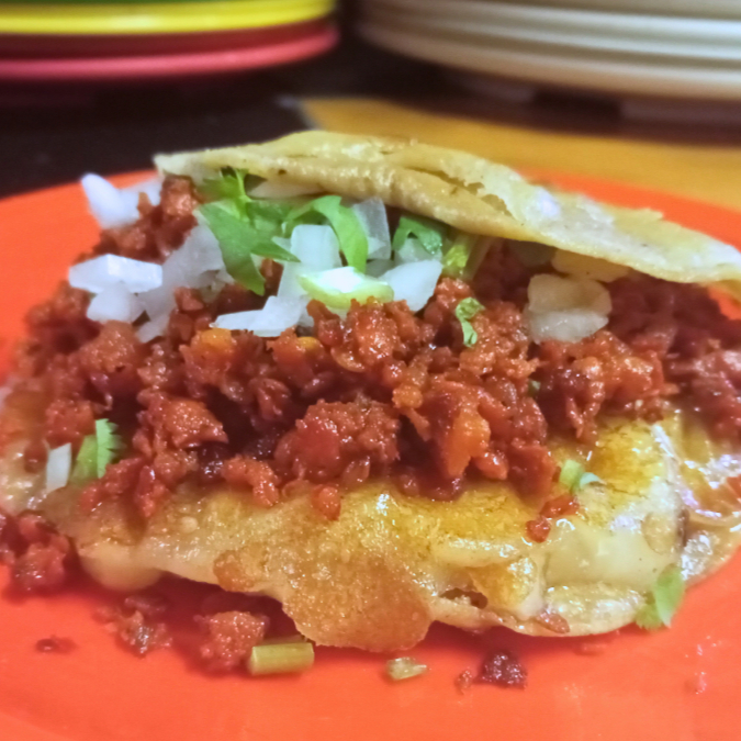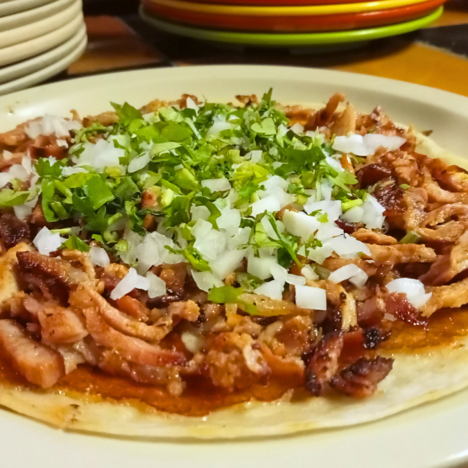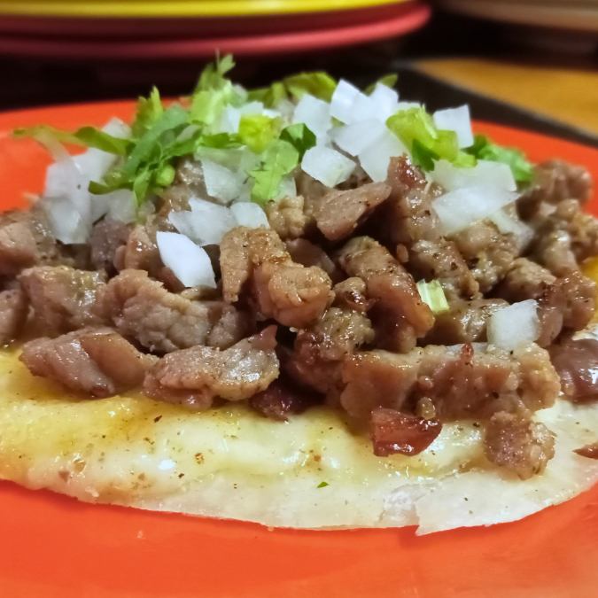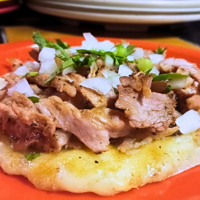 Tortilla de harina tamaño mediano, cubierta con una capa de queso y con una generosa porción de nuestra deliciosa carne al pastor directa del trompo.