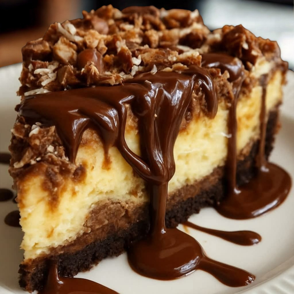 Deliciosa rebanada de pay de queso con topping de cajeta, nuez y trocitos de chocolate amargo, en una base de galleta crujiente.
