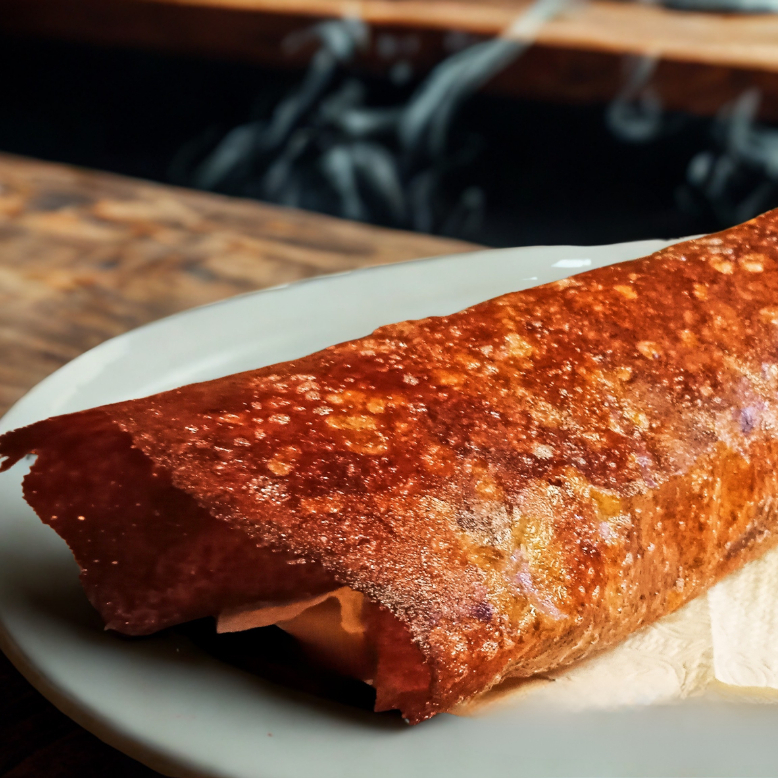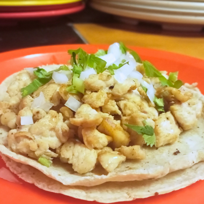 Tortilla de maíz taquera con una porción de tripa doradita de res.