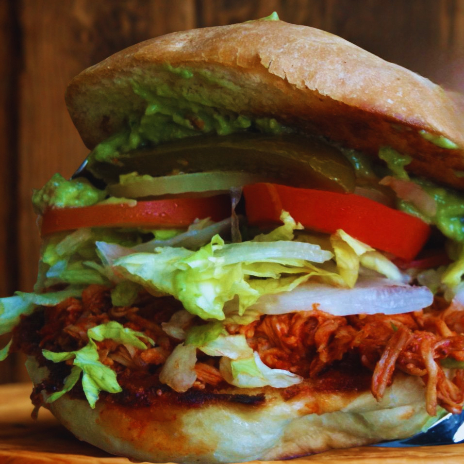 Bolillo de leña crujiente relleno de carne al pastor directa del trompo, con queso fundido, lechuga, jitomate, cebolla, mayonesa, crema, agucate y aderezo especial.