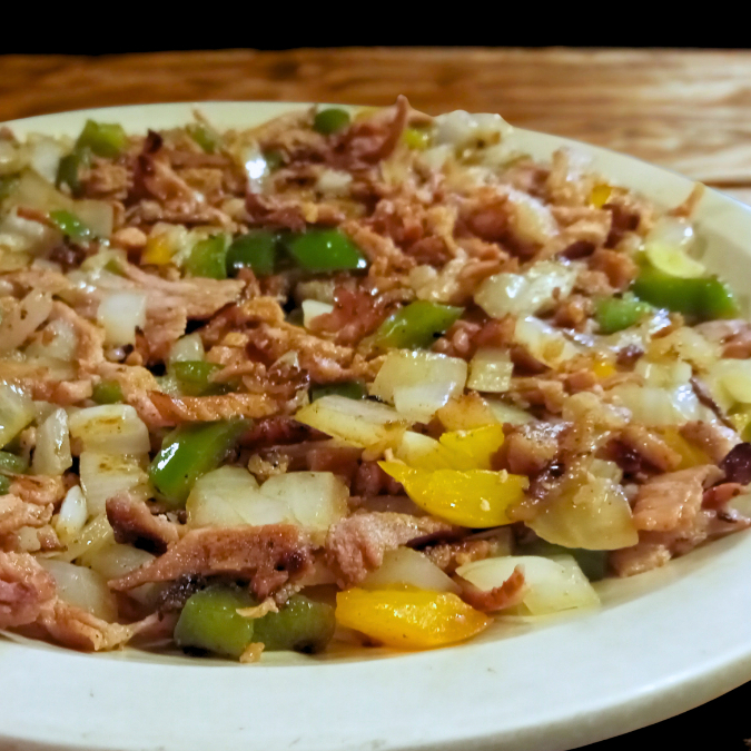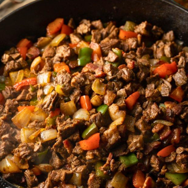 Delicioso bistec de res sazonado y asado a la plancha, combinado con tocino, pimiento morrón y cebolla