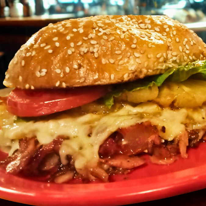 Deliciosa hamburguesa elaborada con pan brioche y carne al pastor directa del trompo, asada a la plancha y aderezada con queso Oaxaca fundido, mayonesa, mostaza, catsup, lechuga, jitomate, cebolla, chile toreado y papas a la francesa.