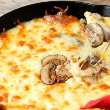 Delicioso queso fundido acompañado de champiñones aderezados y asados a la plancha.