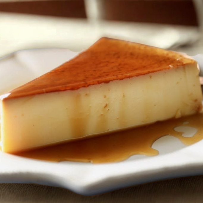 Rebanada del delicioso flan de vainilla casero que tanto amas con un toque de caramelo que exalta tu paladar,