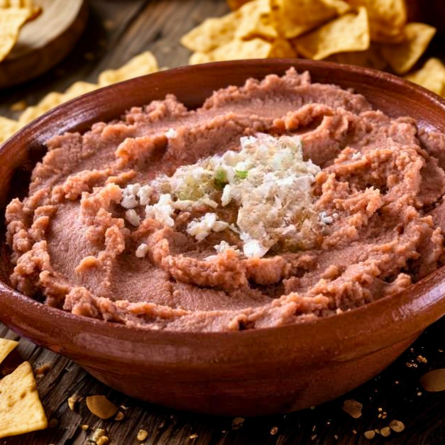 Deliciosos frijoles refritos acompañados con totopos de maiz.