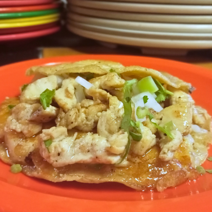 Tostadita de maíz taquera con una porción de pechuga de pollo asado a la plancha