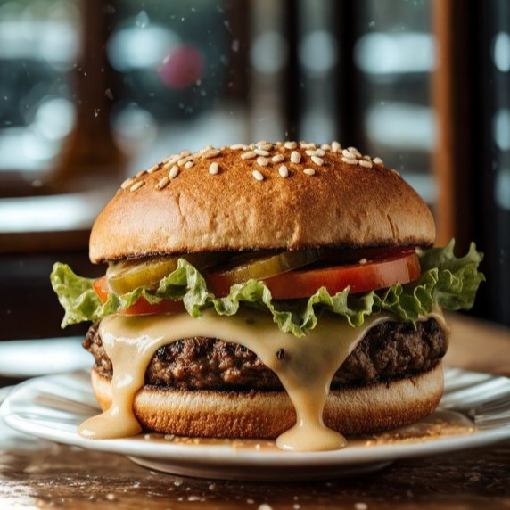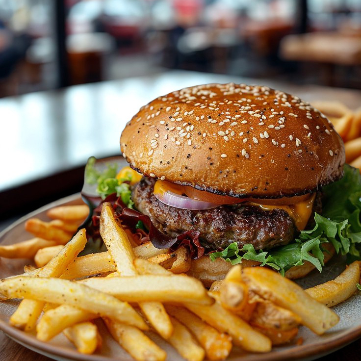 Deliciosa hamburguesa elaborada con pan brioche y carne de sirloin, asada a la plancha y aderezada con queso, mayonesa, mostaza, catsup, lechuga, jitomate, cebolla, chile toreado y papas a la francesa