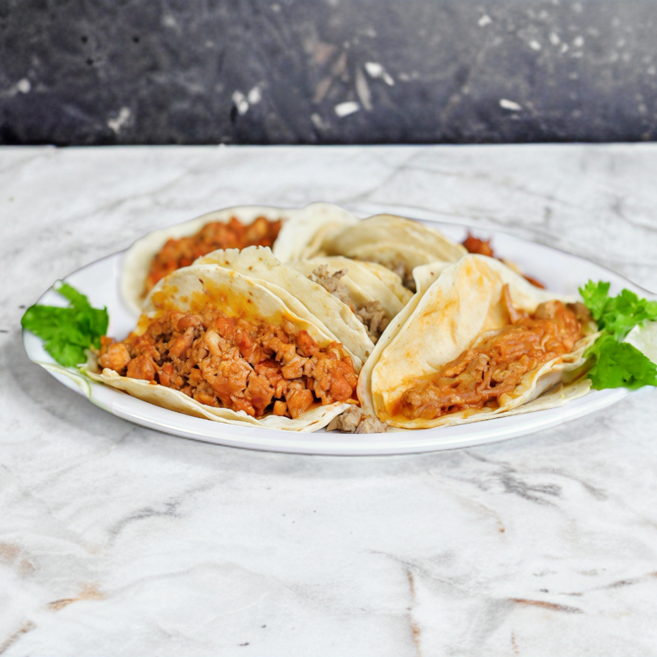 Taco de adobada de cerdo, doble tortilla, la verdura y salsas se envian por separado.