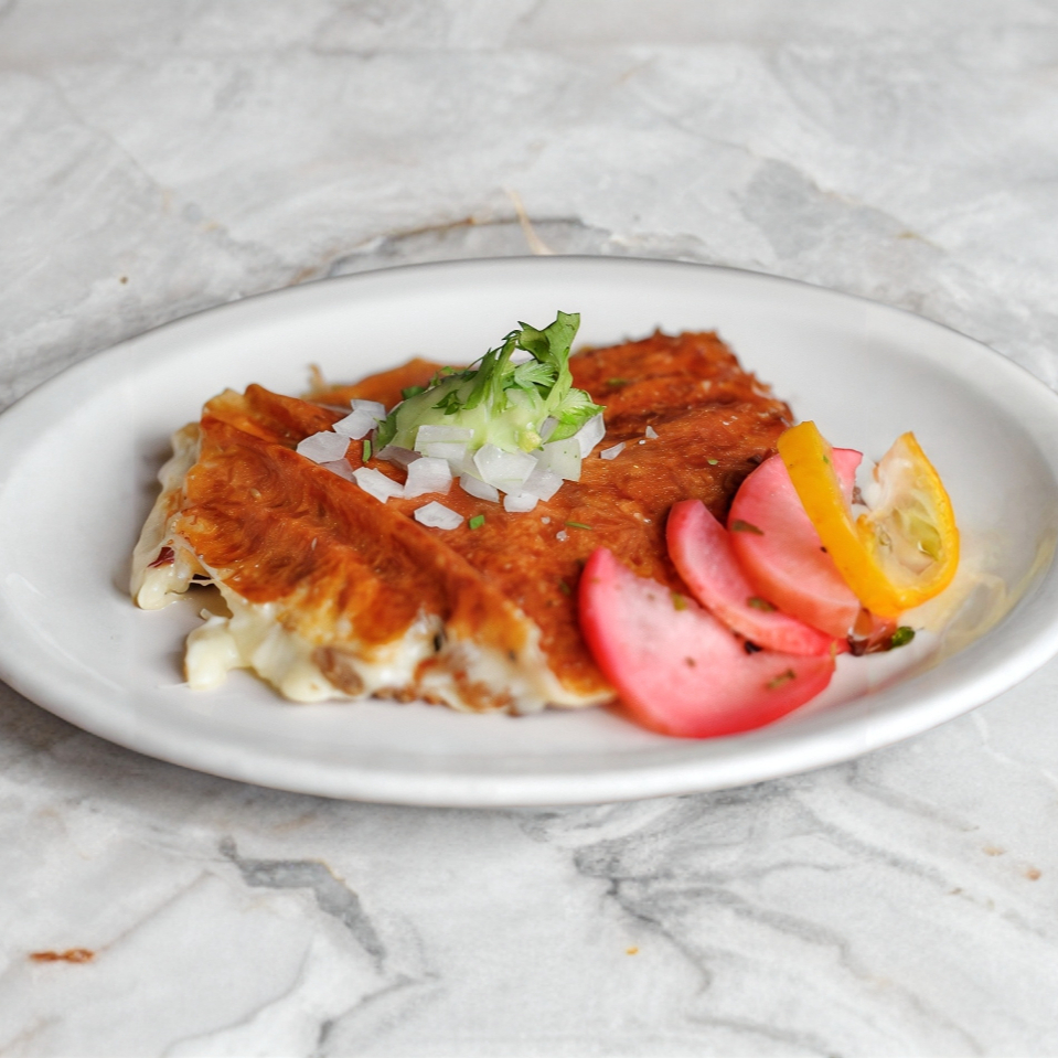 Tortilla dorada con queso derretido acompañado de carne adobada, salsa y verdura se incluyen por separado.