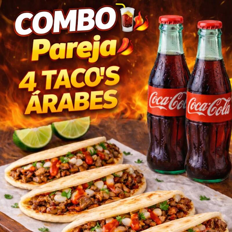 4 tacos árabes + 2 refrescos. Perfecto para compartir y disfrutar el auténtico sabor Arabika.