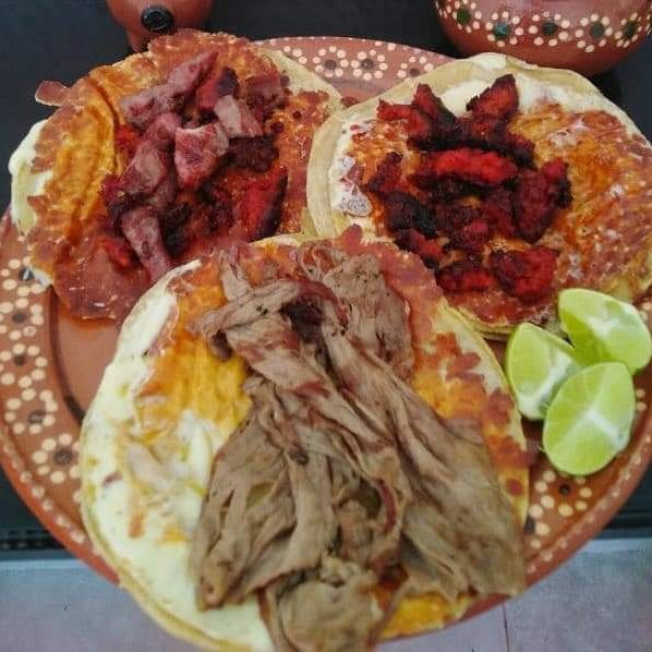 Tortilla de comal bien doradita con queso asadero arrachera y chorizo con guarniciones y salsa a elegir 😋