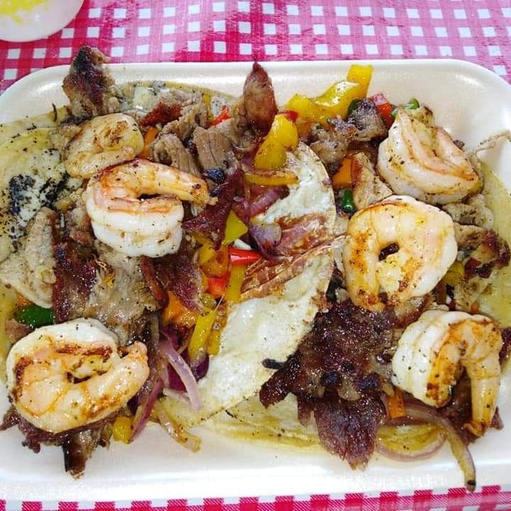 2 tortillas de comal acompañadas de rico queso asadero pimiento morrón cebolla morada y camarones previamente sazonados mas nuestro toque especial y delicioso aderezo de la casa!! Te encantara cuando lo prubes es unico y especial como tu!!!(no lleva carne asada)