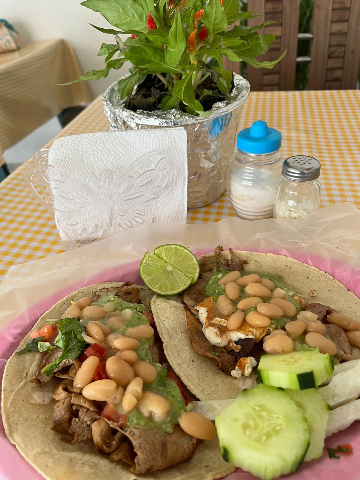 Doble tortilla con carne asada acompañada de salsas y frijoles.