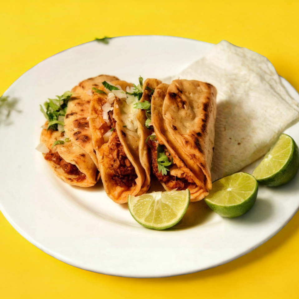 Doble tortilla de maíz con barbacoa de res, dorado en su propio sabor.
