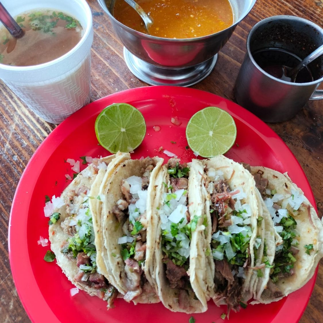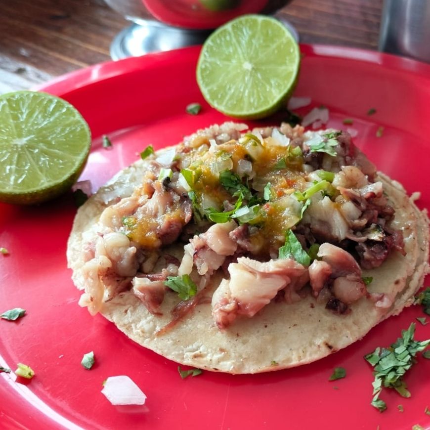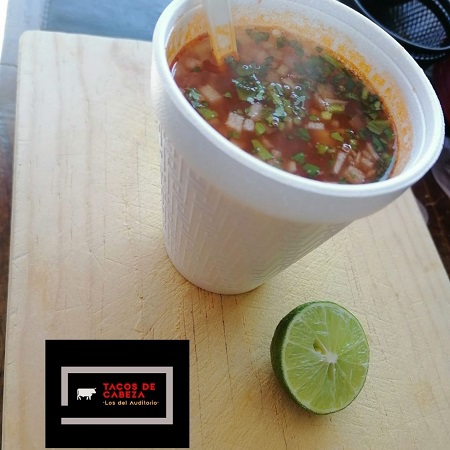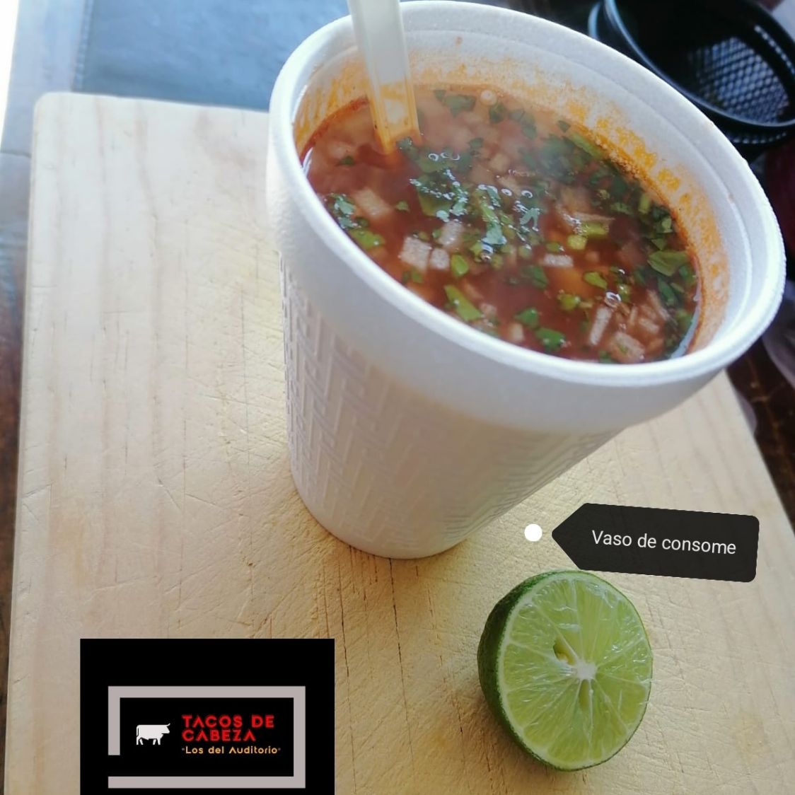 Delicioso consome de cabeza de res guisado acompañado de cilantro, cebolla, limón y salsa verde.Vaso de 8 onzas