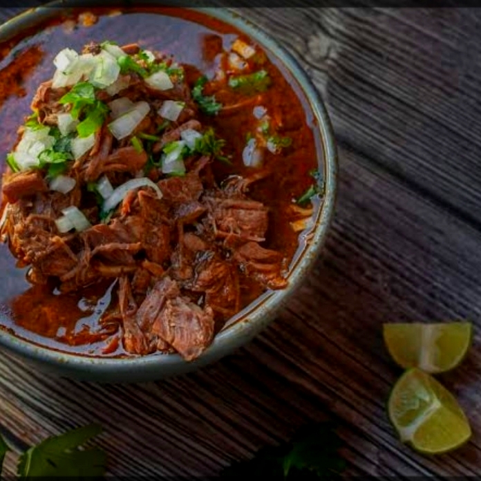 Delicioso consome de cabeza de res guisado acompañado de cilantro, cebolla, limón y salsa verde