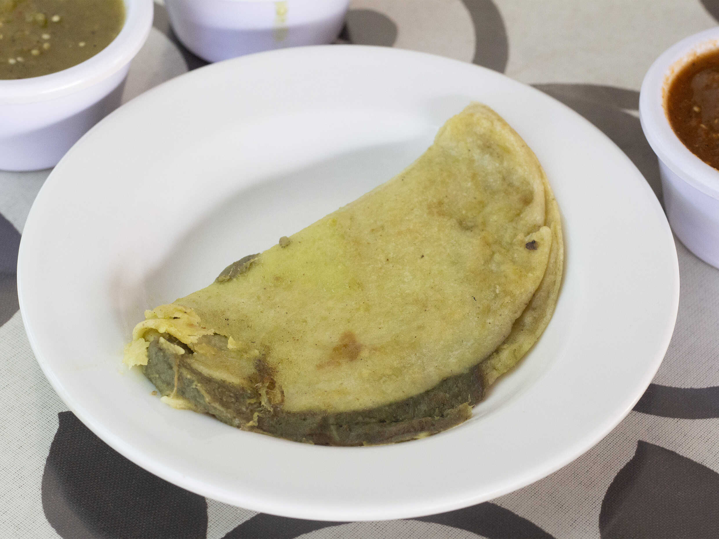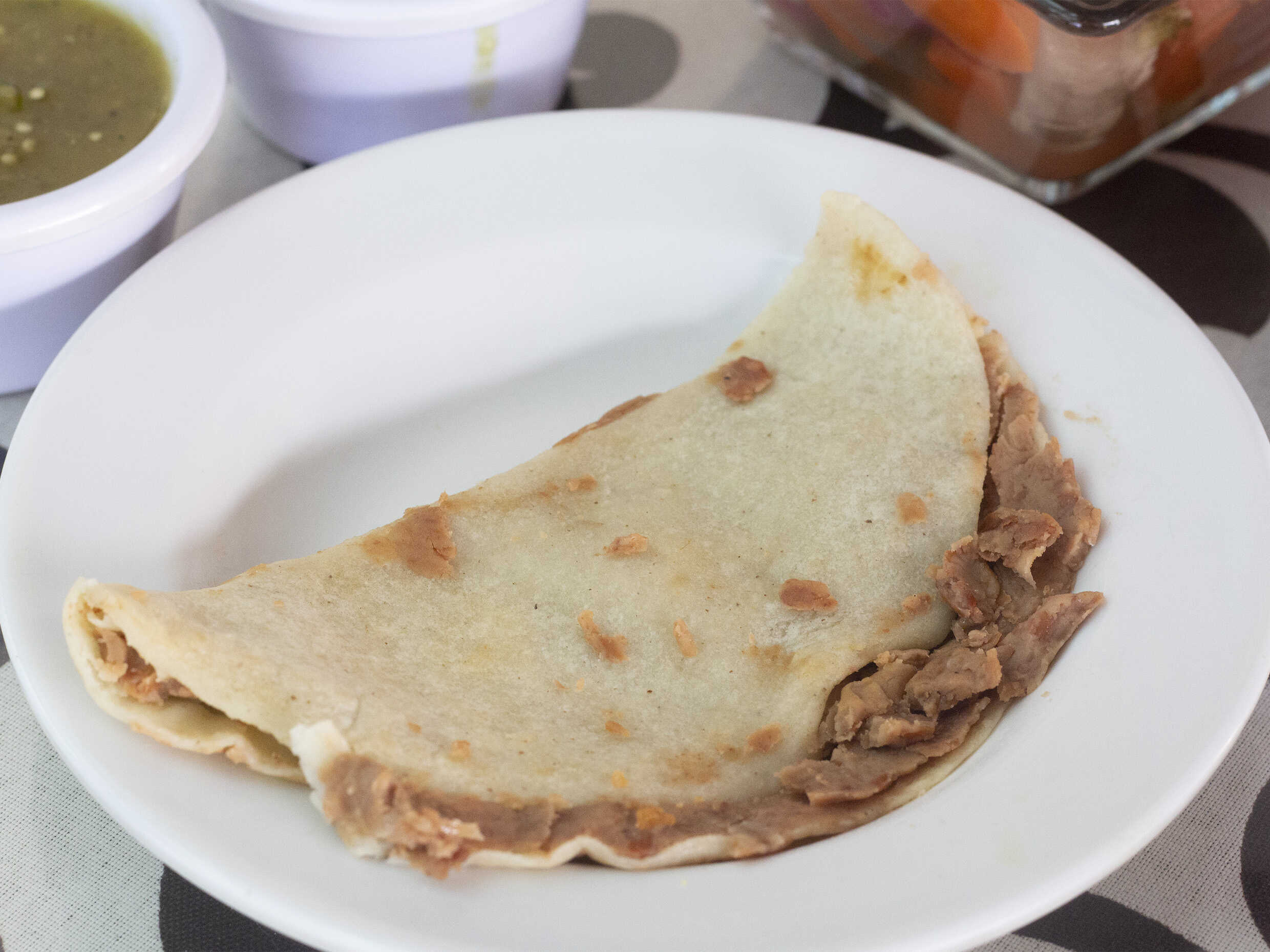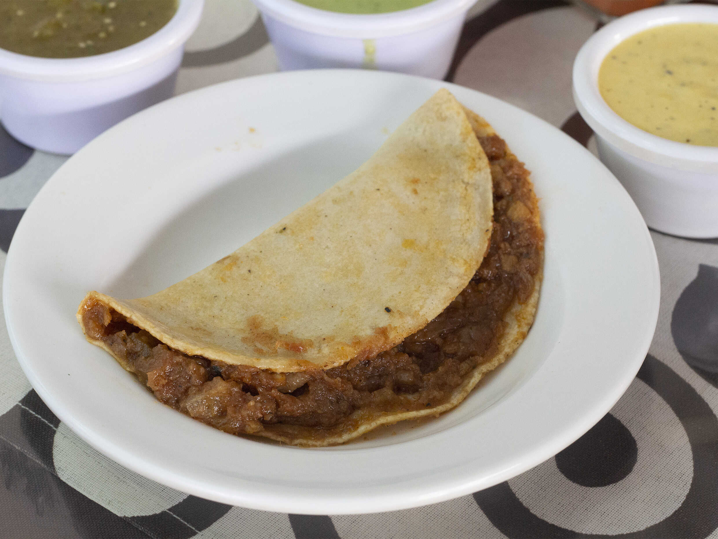 Taco de canasta con carne de res deshebrada en salsa verde.