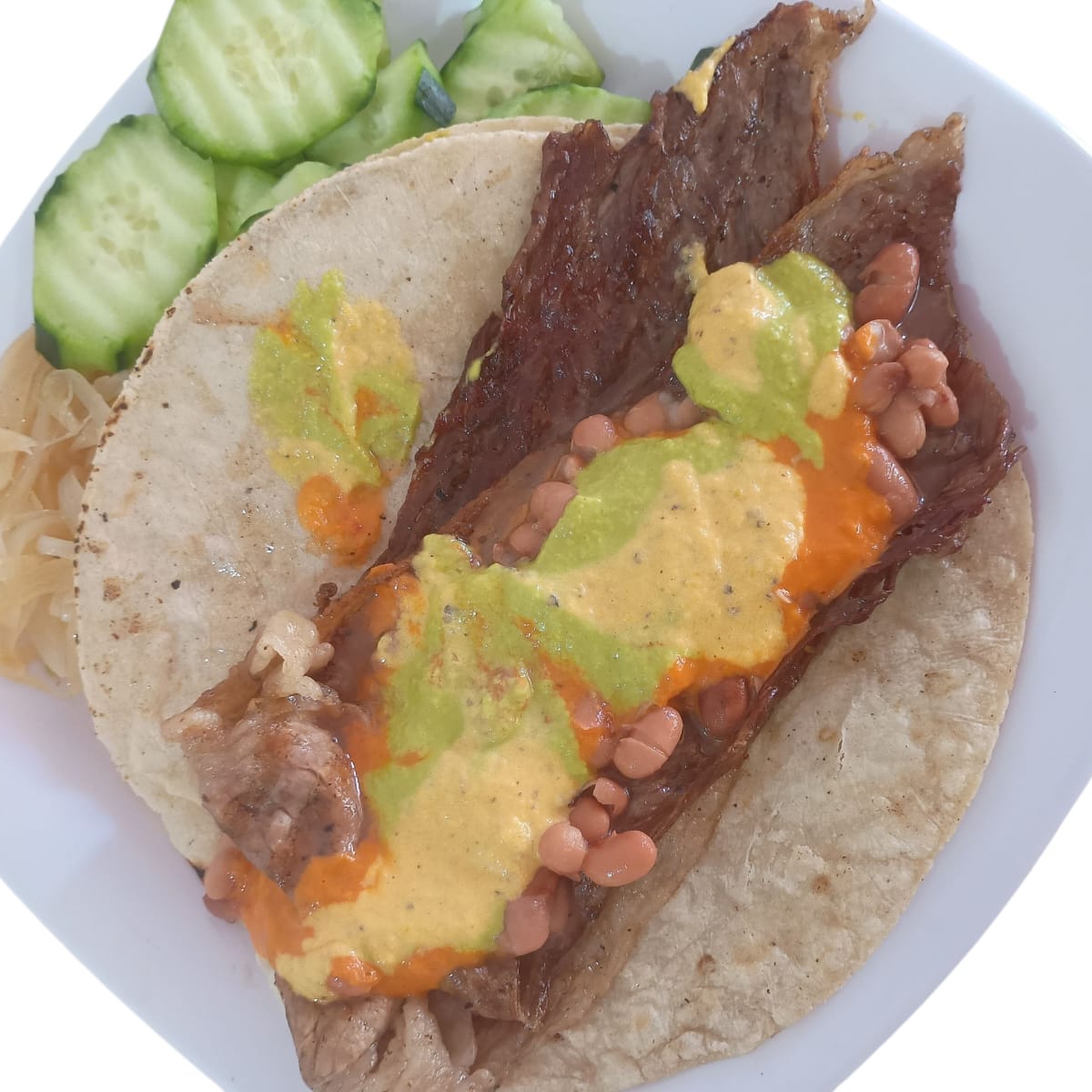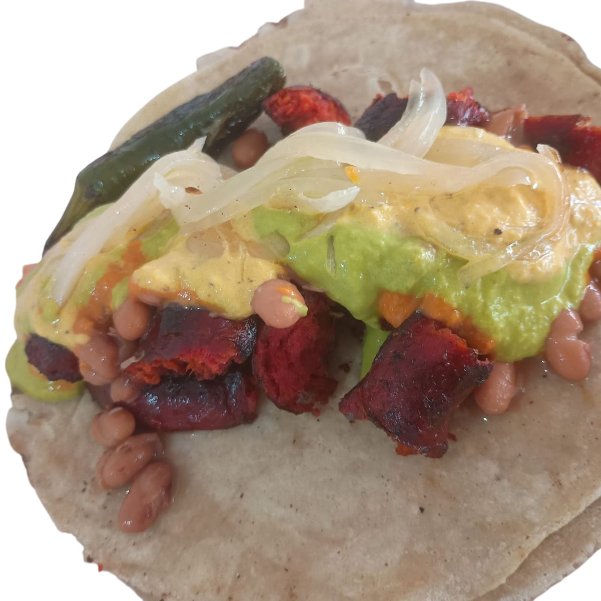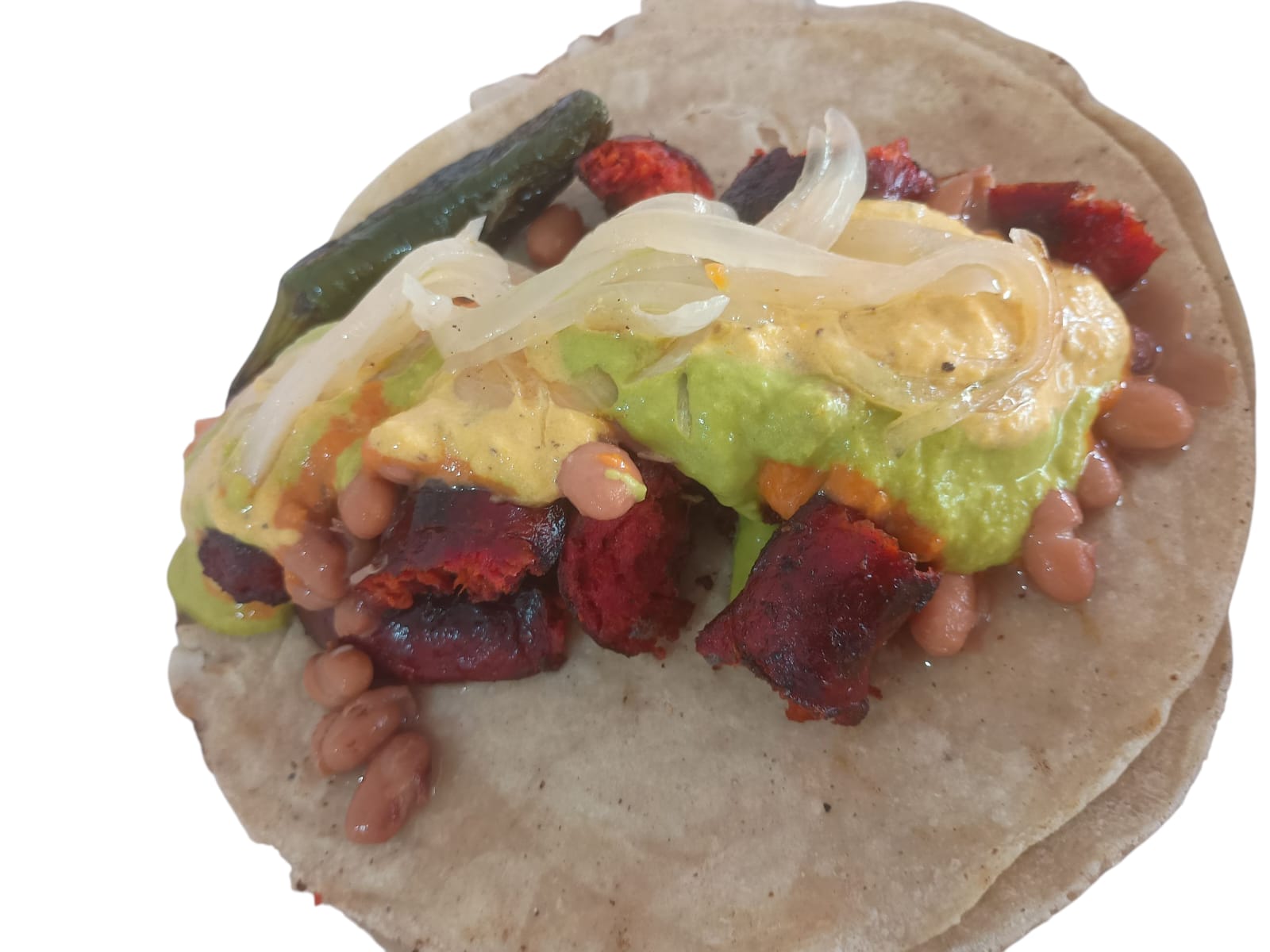 Carne de res y chorizo, 2 tortillas gdes hechas a mano acompañado con cebollitas asadas al gusto (50 g aprox).
