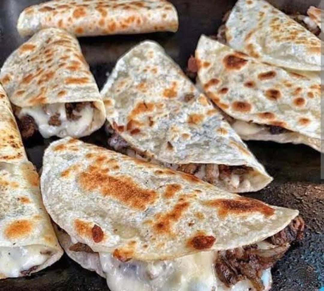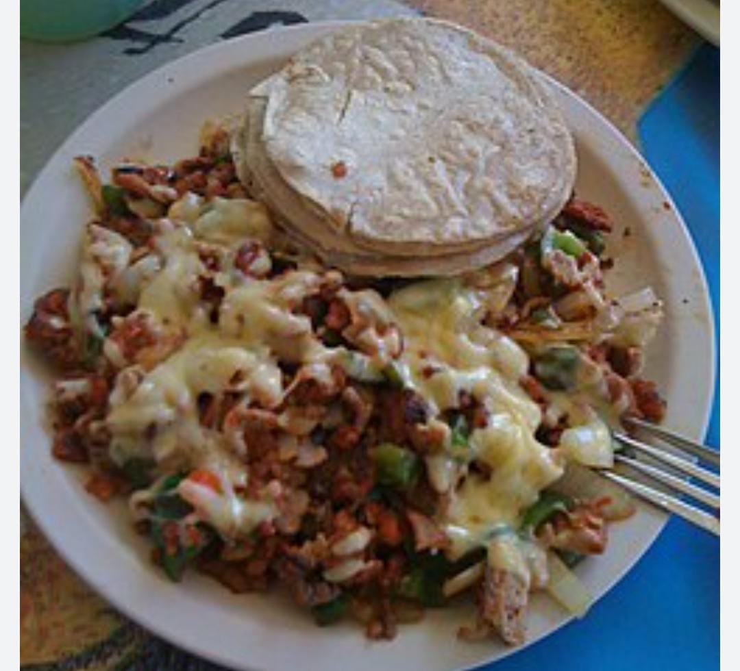Platillo personal: Acompañados de carne a elegir, 10 tortillas chicas, lleva cebolla, chile morrón, jitomate y queso Oaxaca.