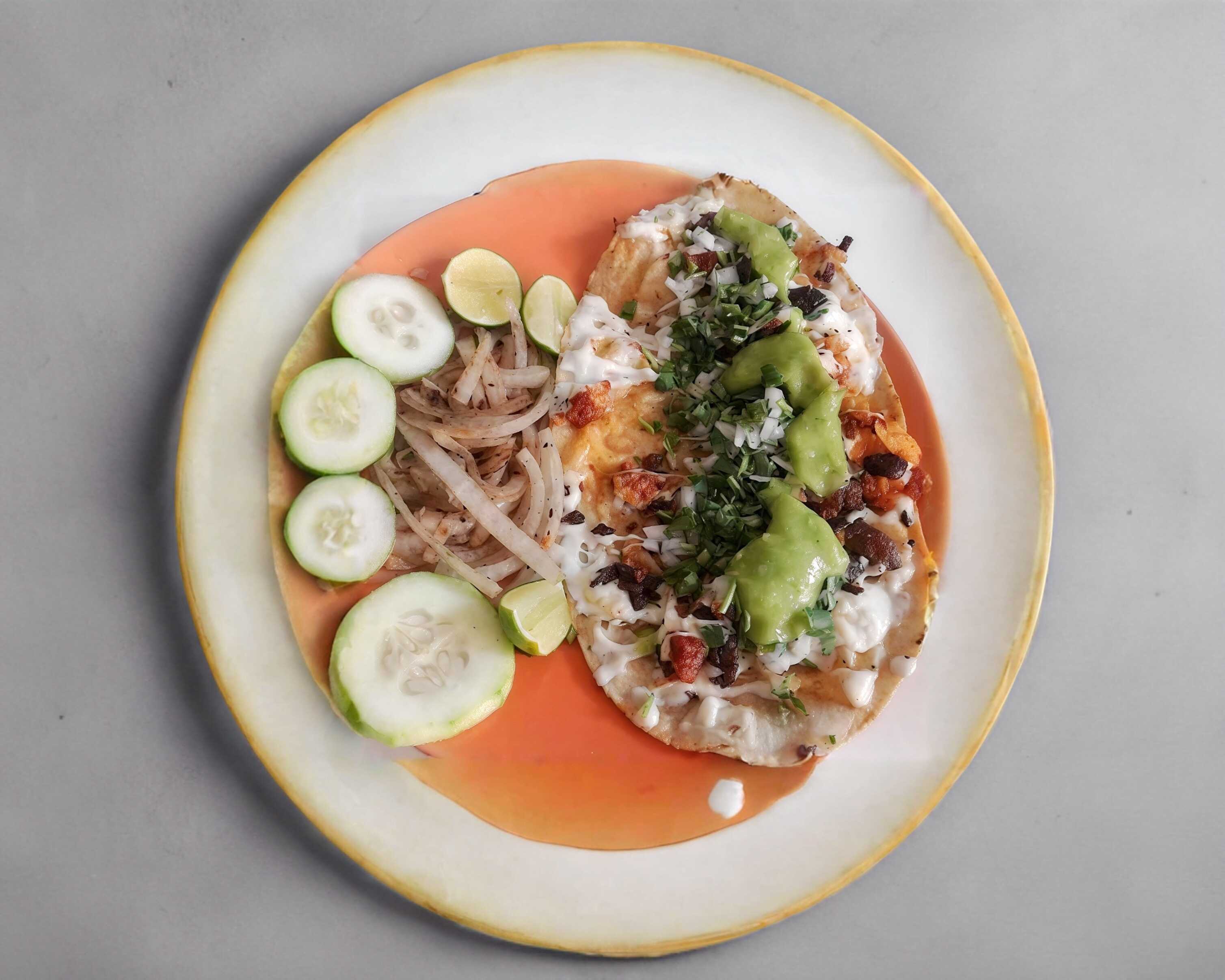 Carne a elegir, queso Oaxaca, tortilla de maíz grande.