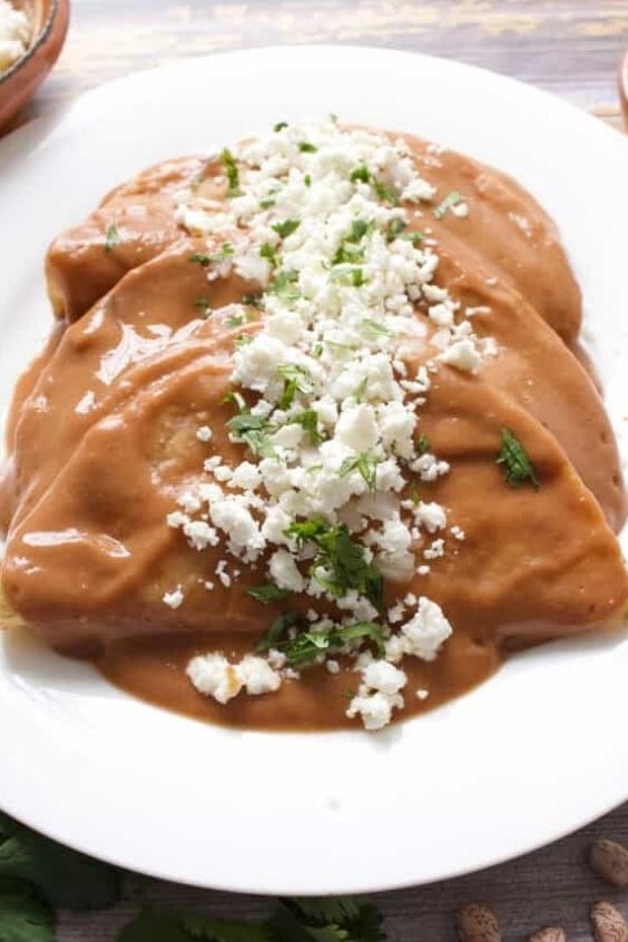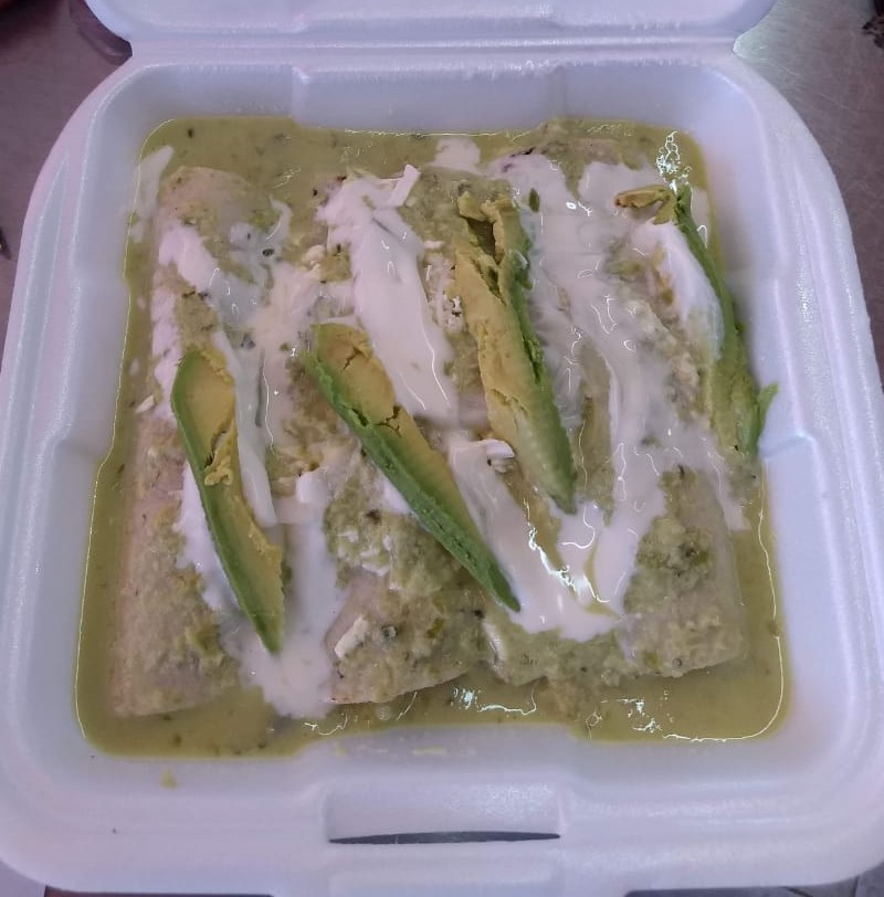 Elaborado con tortillas de maíz rellenas con pollo, bañadas con salsa verde y gratinadas con queso manchego.