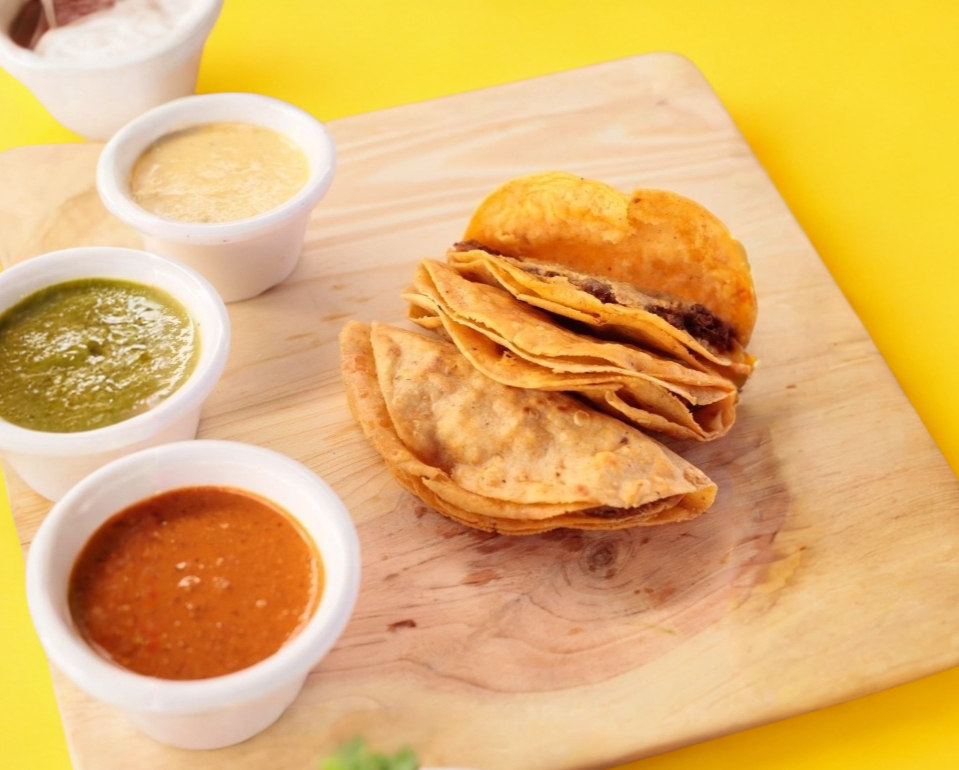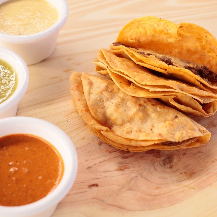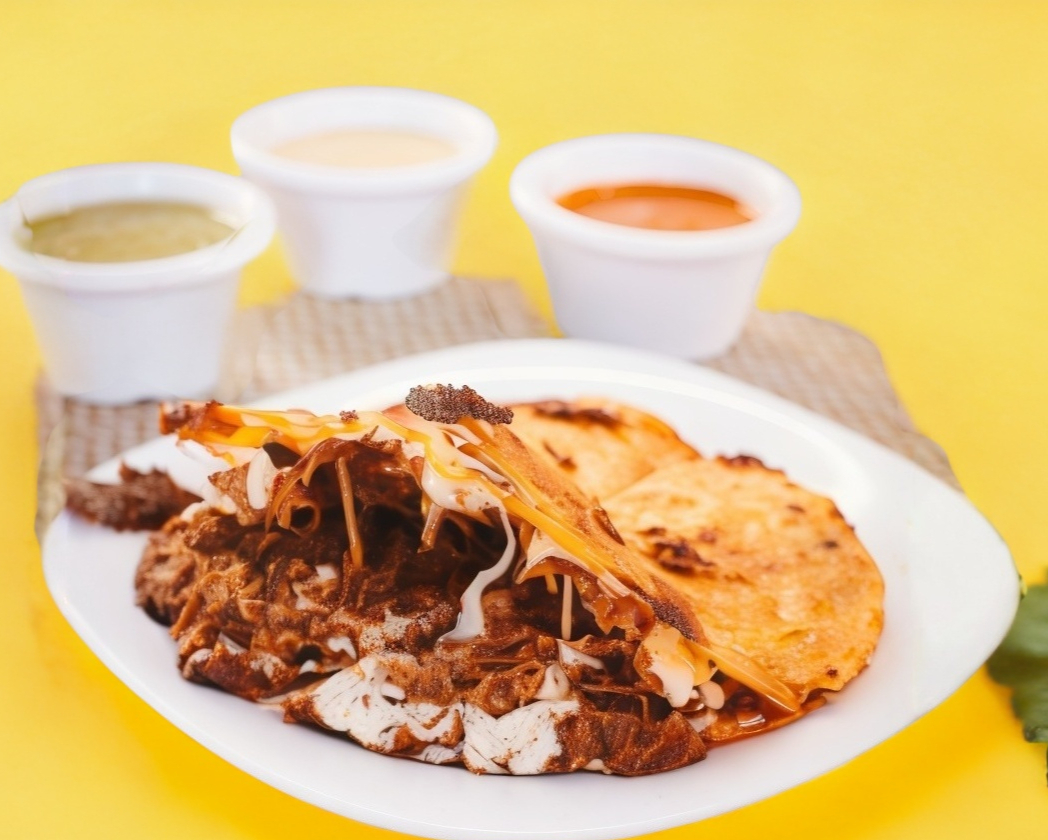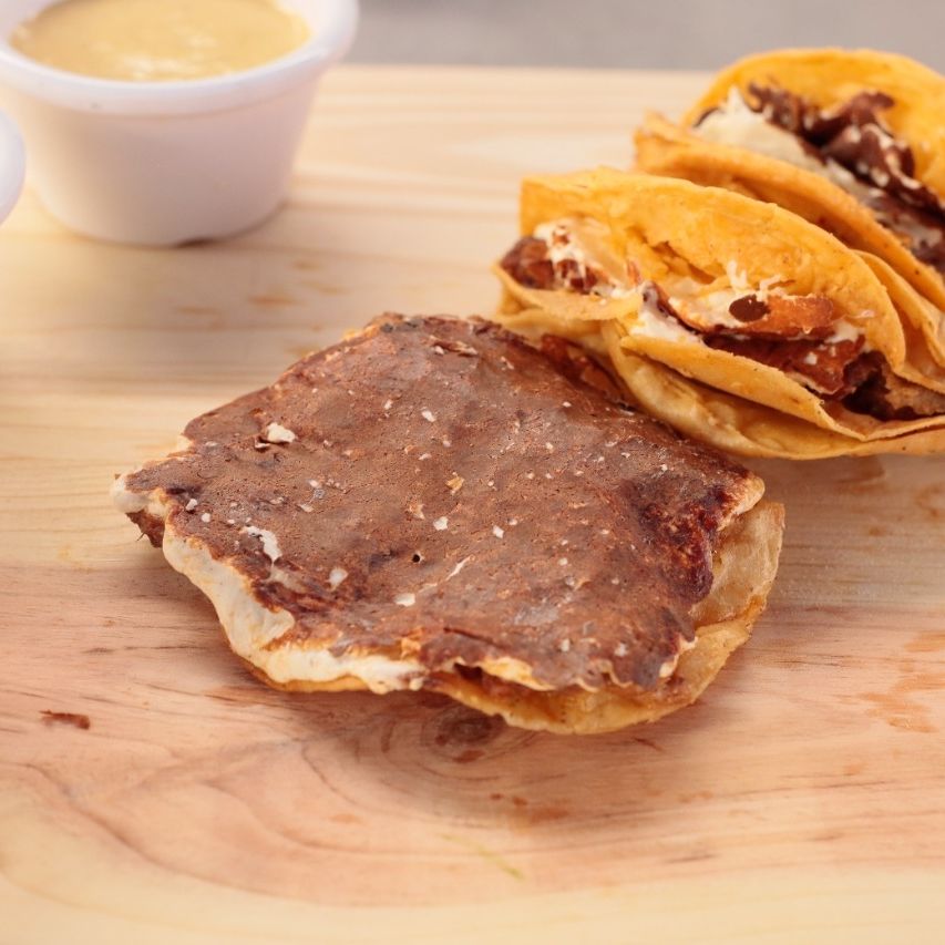 2 tortillas a la plancha con queos ambas y carne ne medio, salsa a elegir verde, roja o amarilla