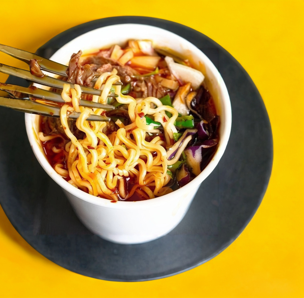 Pasta tipo ramen acompañada de consomé y trozos de res