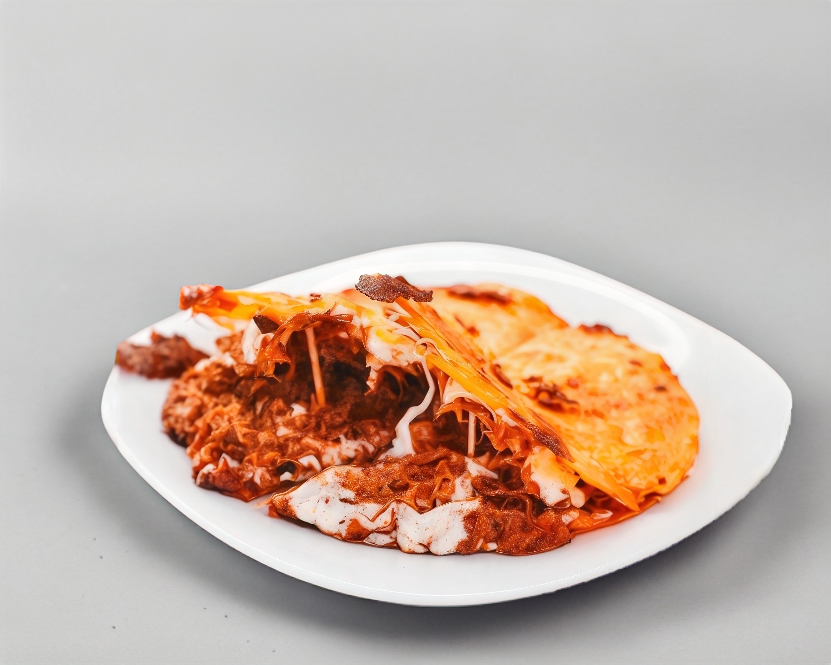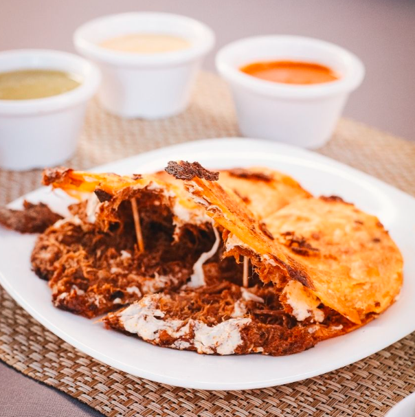 2 tortillas a la plancha, ambas con queso y barbacoa en medio.
