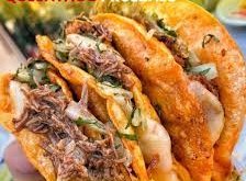 Taco con tortilla de maíz, queso fundido y cabeza de res